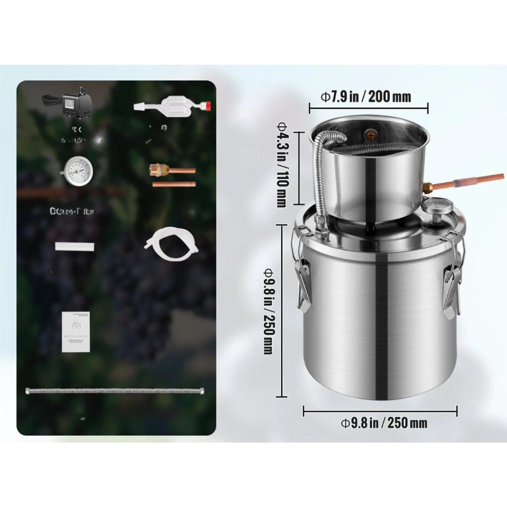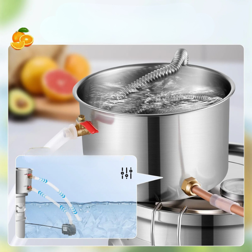 Ha olyan megbízható és kompakt alkohollepárló készüléket keres, amely otthoni használatra is professzionális minőséget kínál, akkor ez a 11,4 literes rozsdamentes acél lepárlókészlet kiváló választás. A készülék minden eleme élelmiszeripari minőségű SUS201 rozsdamentes acélból készült, így teljesen biztonságos az alapanyagokkal való érintkezés során.