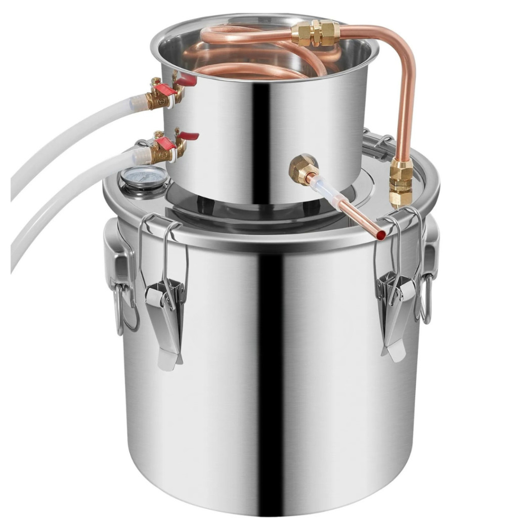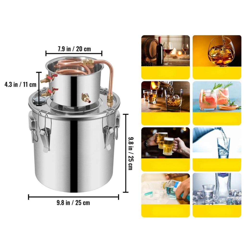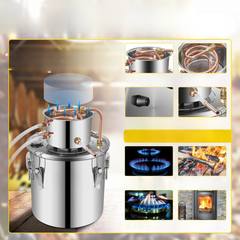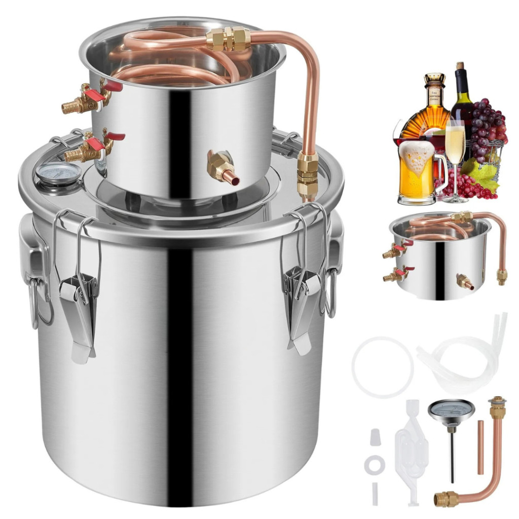 Ez a 11,4 literes alkohollepárló készülék kiváló választás mind kezdőknek, mind haladóknak, akik otthoni környezetben szeretnének minőségi párlatokat előállítani. A lepárló teljes egészében élelmiszeripari minőségű rozsdamentes acélból, vörösrézből és szilikonból készült, így biztosítja a higiénikus, biztonságos és tartós használatot. Kiválóan alkalmas whisky, rum, pálinka, vodka, borpárlat, desztillált víz vagy akár illóolaj készítésére.