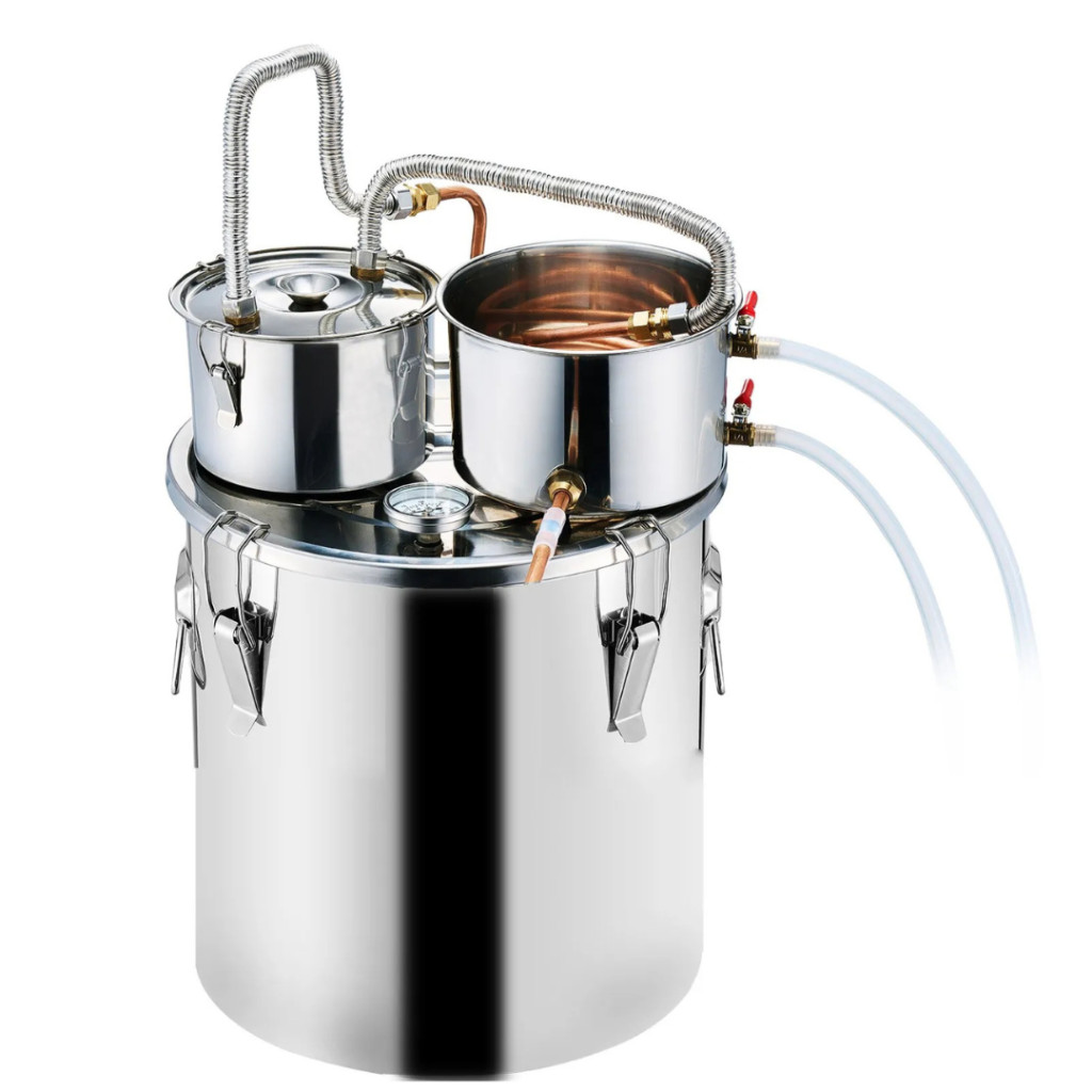 Alkohol lepárló készülék 30 literes rozsdamentes acél pálinkafőző rézspirállal, dupla kondenzátorral, másodlagos desztillációval