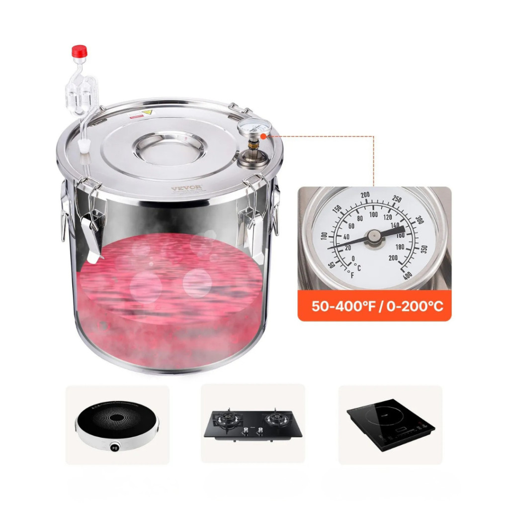 A fedélen lévő Celsius–Fahrenheit hőmérő segít a lepárlási hőmérséklet pontos szabályozásában.
