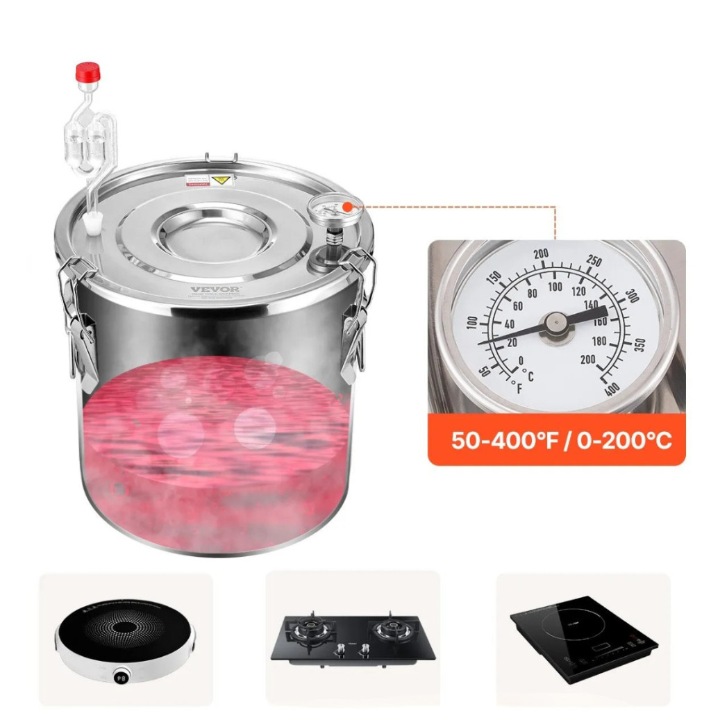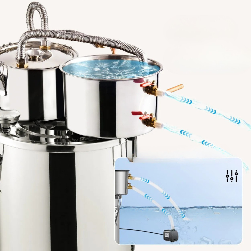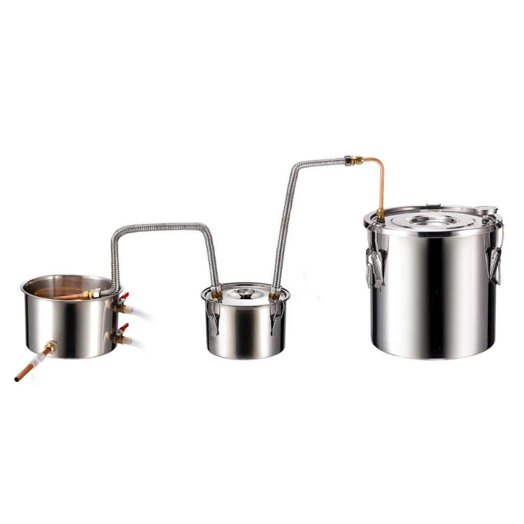 Alkohol lepárló 19 L rozsdamentes acél pálinkafőző réz hűtőspirállal dupla kondenzáció, otthoni párlatkészítéshez