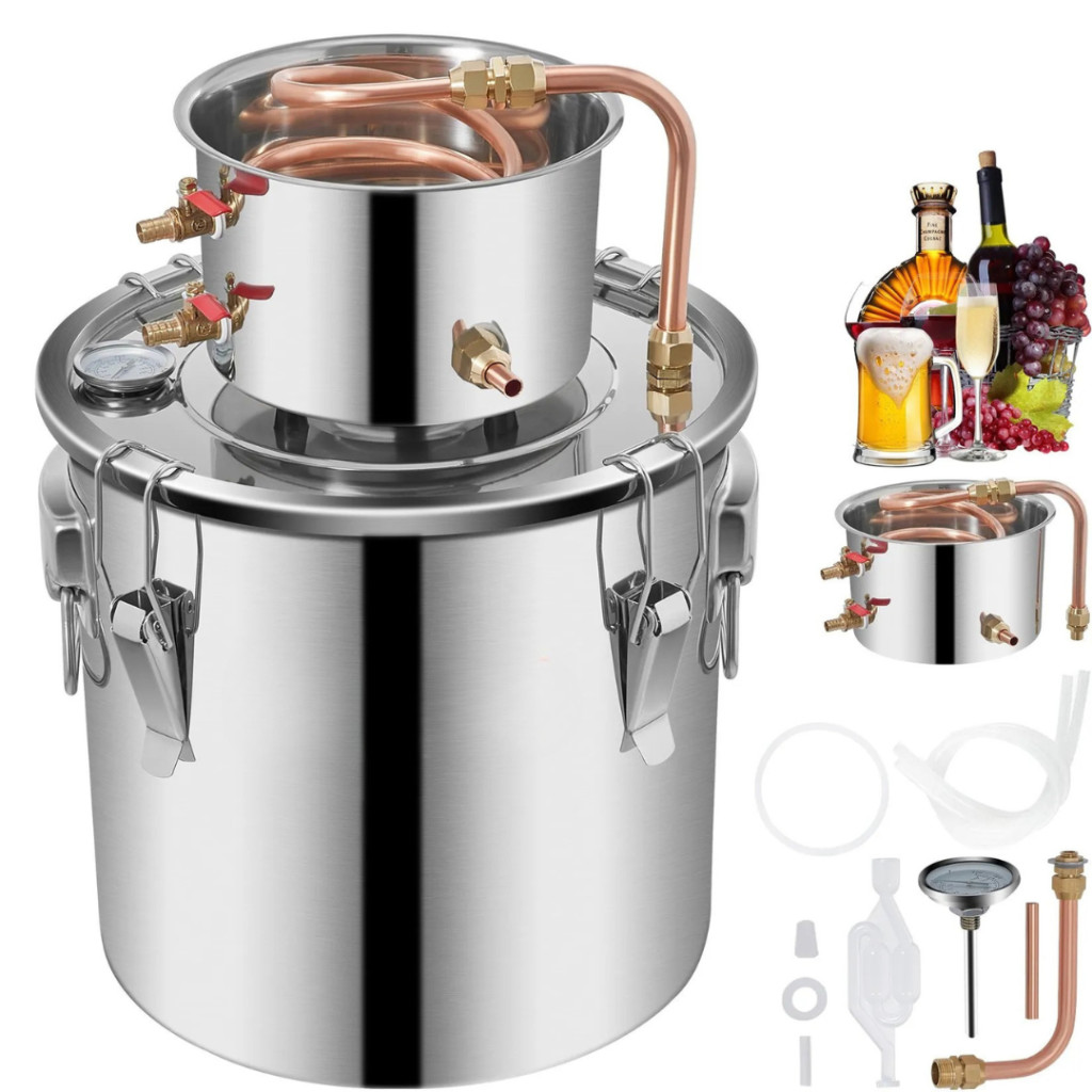 Alkohol lepárló 19 literes alkohol desztilláló rézspirállal és vízforgató szivattyúval, pálinkafőző hőmérővel