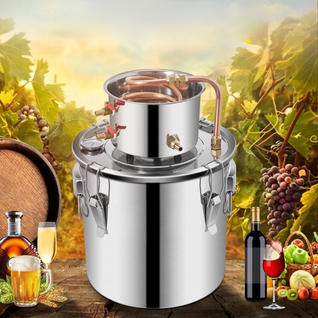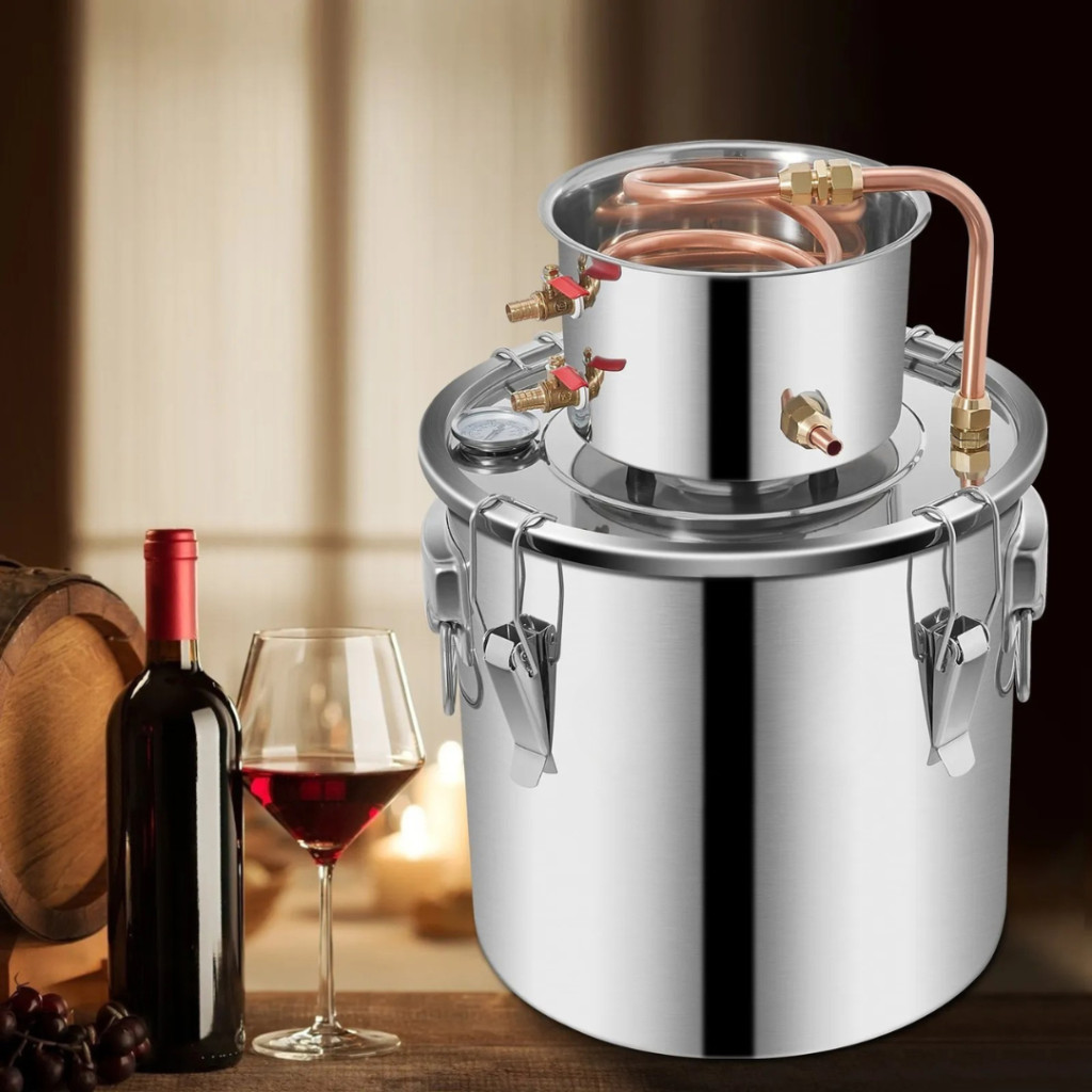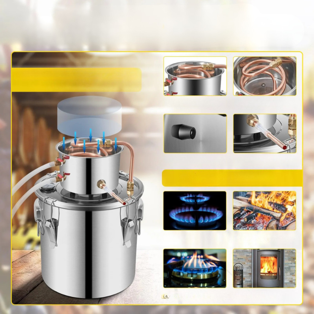 A 19 literes alkohollepárló készülék kiváló választás mindenkinek, aki otthoni környezetben szeretne minőségi párlatokat, whiskyt, rumot, pálinkát vagy akár illóolajokat előállítani. A készülék minden eleme élelmiszeripari minőségű rozsdamentes acélból, vörösrézből és szilikonból készült, így teljes mértékben biztonságos az alapanyagokkal való érintkezésben.