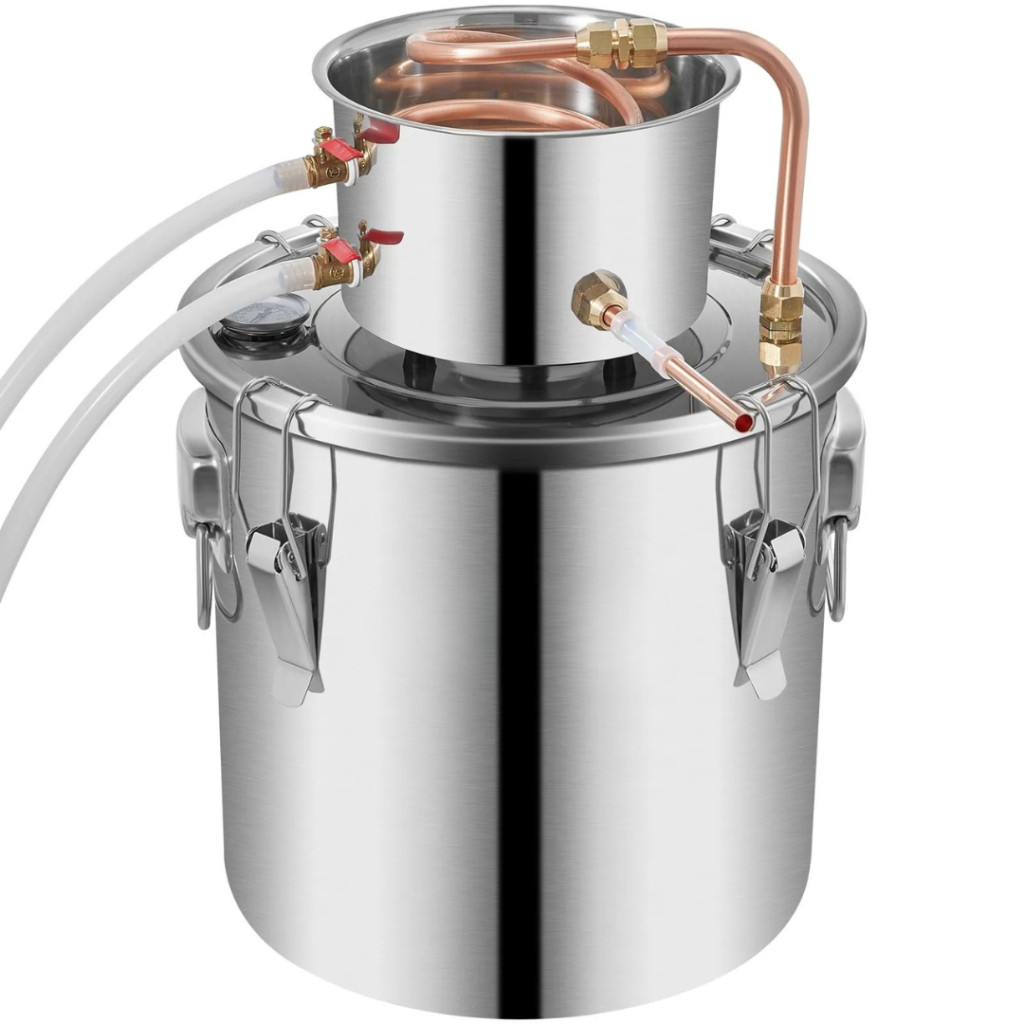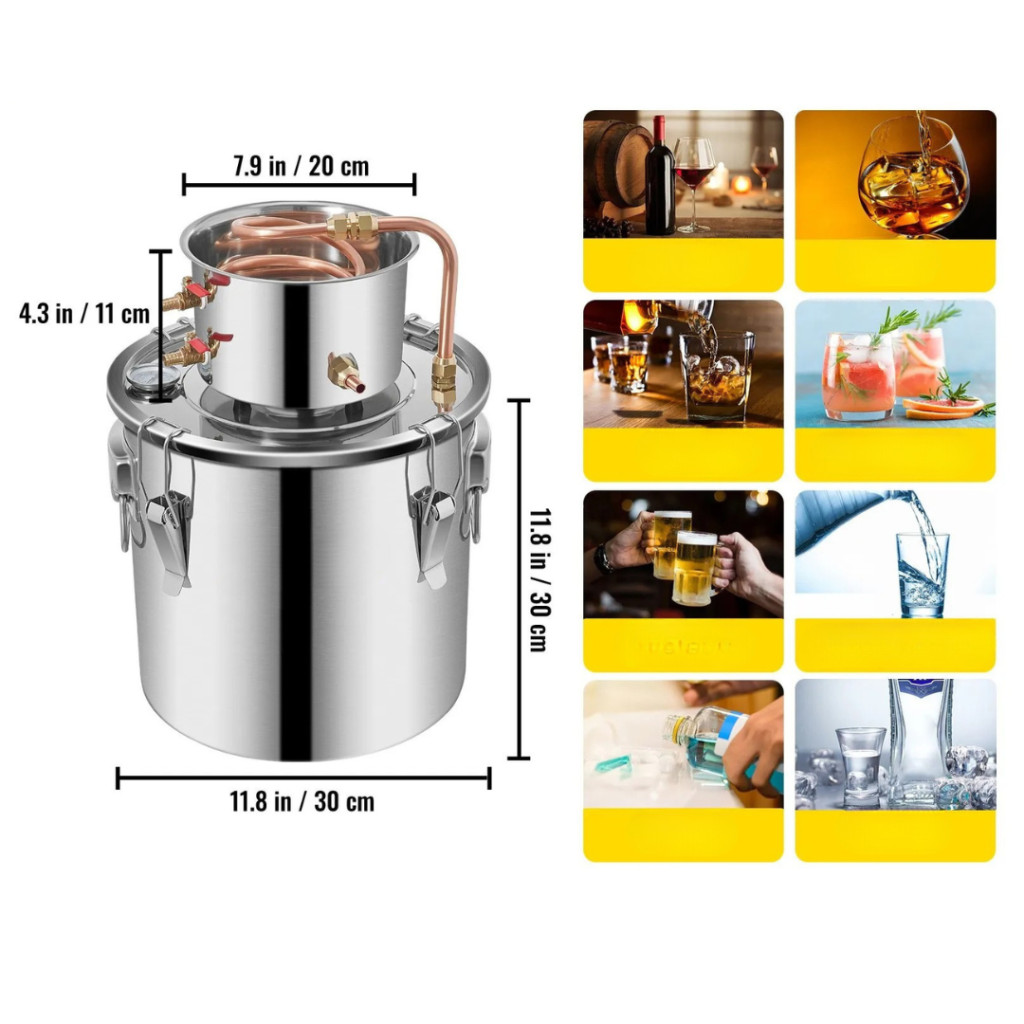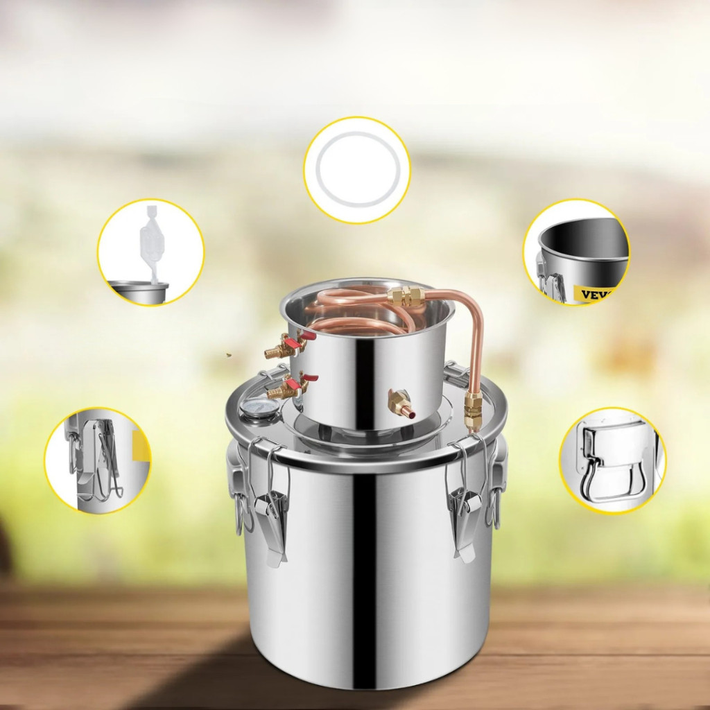A 19 literes alkohollepárló készülék kiváló választás mindenkinek, aki otthoni környezetben szeretne minőségi párlatokat, whiskyt, rumot, pálinkát vagy akár illóolajokat előállítani. A készülék minden eleme élelmiszeripari minőségű rozsdamentes acélból, vörösrézből és szilikonból készült, így teljes mértékben biztonságos az alapanyagokkal való érintkezésben.