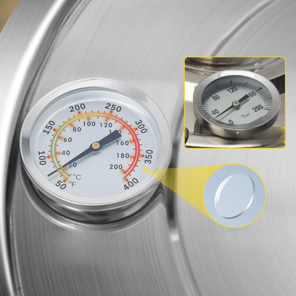 A fedélbe épített hőmérő Celsius- és Fahrenheit-skálán jelzi az aktuális hőmérsékletet, így a lepárlási folyamat könnyen nyomon követhető.