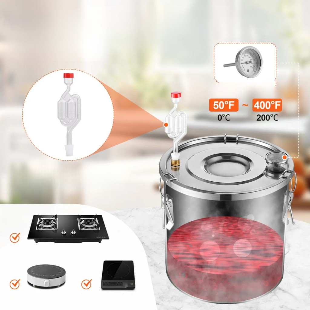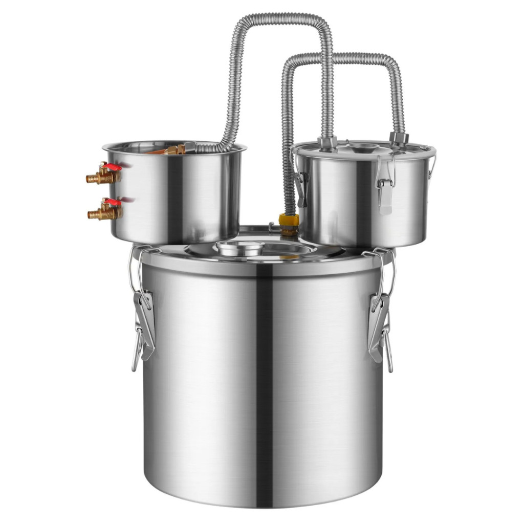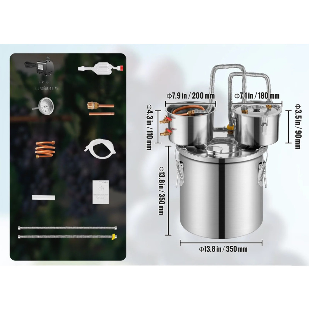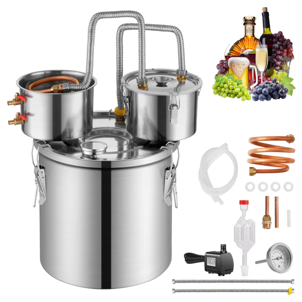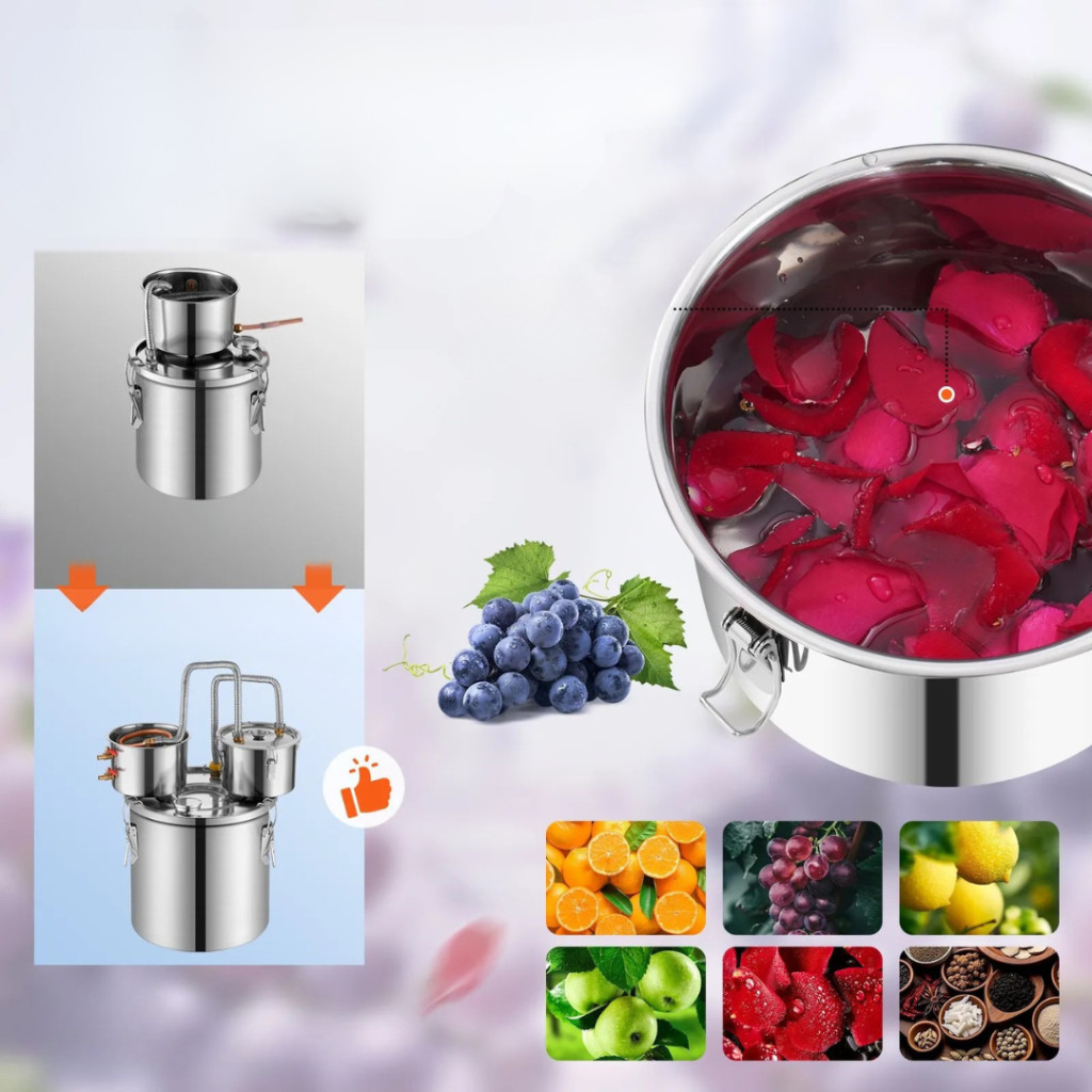 Fedezze fel a prémium minőségű 30 literes alkohollepárló készüléket, amelyet kifejezetten otthoni párlatkészítéshez fejlesztettek. A készülék dupla kondenzátoros kialakítást, thumper (másodlagos) desztillációs rendszert, valamint gyors és hatékony hűtést biztosító vízpumpát tartalmaz. Kiváló választás azoknak, akik gyümölcsbort, whiskyt, brandy-t, vodkát, illóolajat, desztillált vizet vagy akár etanolt szeretnének biztonságosan előállítani otthon.