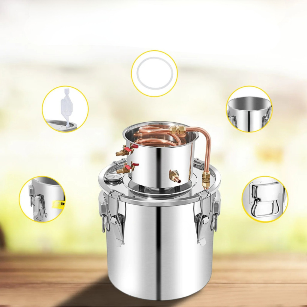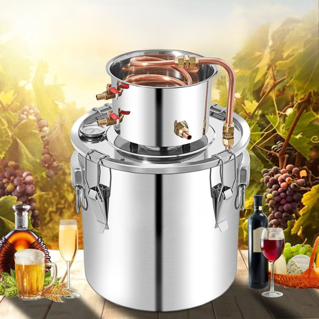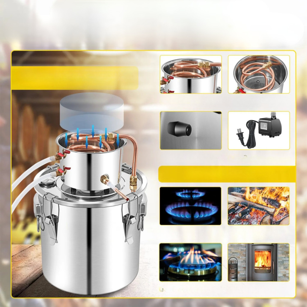 Alkohol lepárló 50 literes alkohol desztilláló berendezés rozsdamentes acél, nagy kapacitású pálinkafőző, erős hűtőspirállal