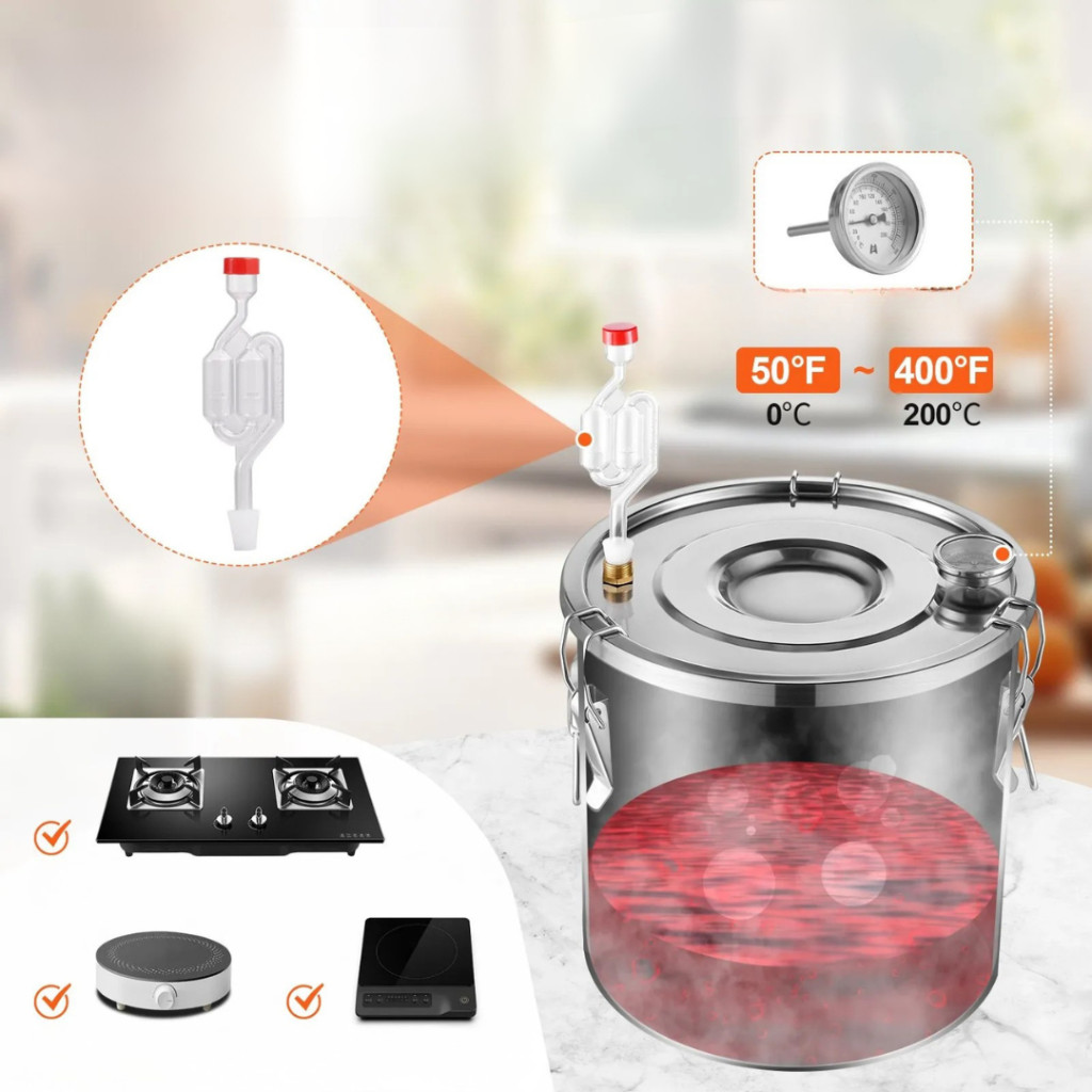 A fedélen elhelyezett egyirányú nyomáscsökkentő szelep kiengedi az erjedés során keletkező gázokat, így biztosítja a stabil fermentációt.