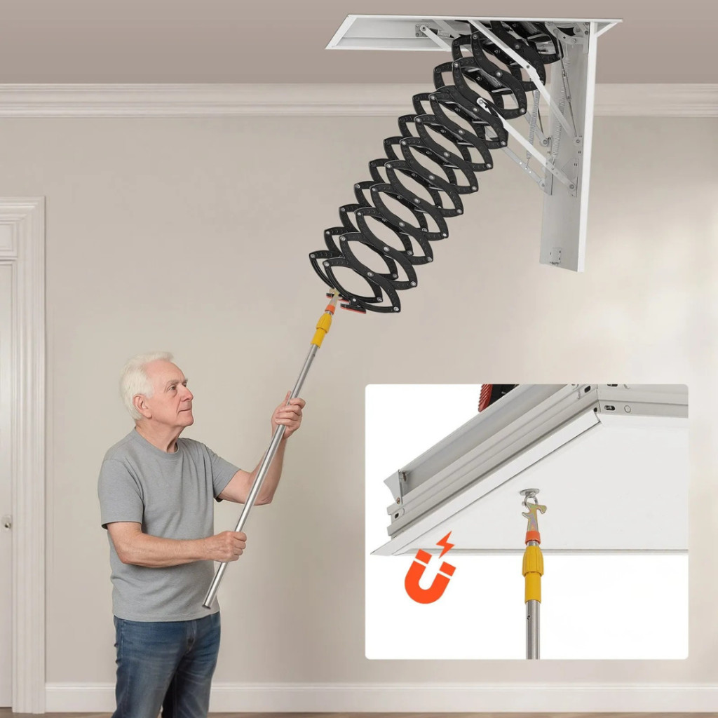 A rozsdamentes acél húzórúd és gyűrű lehetővé teszi, hogy a lépcsőt egyetlen mozdulattal lehúzza vagy visszazárja. Nincs szükség külön eszközökre vagy segédlétrára. A mágneses ajtópanel szorosan záródik, így a padlásfeljáró diszkréten beolvad a mennyezet síkjába, megőrizve a helyiség esztétikus megjelenését.