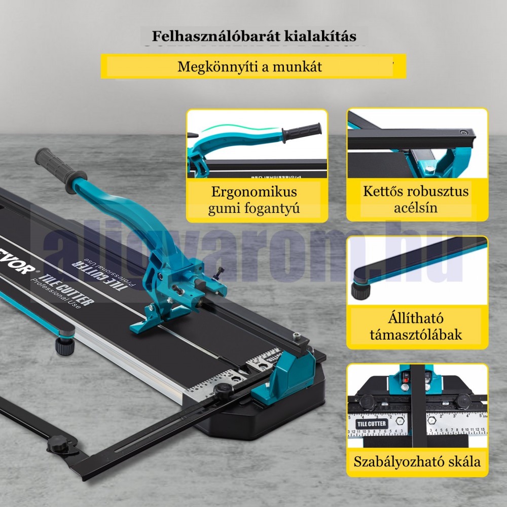 A porcelán csempevágó ideális minden típusú csempe vágására, beleértve a kerámia, porcelán csempék, normál padlólapok és csiszolt csempék vágását is. A szuper kemény ötvözetből készült vágókorong sima, pontos és tiszta vágást biztosít. Az infravörös lézeres pozicionáló funkció hatékonyan javíthatja a porcelán csempe vágó pontosságát. A vonalzó lehetővé teszi a folyamatos gyors vágást különböző méretekben. A csempevágó váza alumíniumból készült. Kompakt, erős és robusztus. A tömör sín pontosabbá teszi a vágási munkát, és hosszú távú használatra alkalmas. A csúszásmentes gumi fogantyú ergonomikus és kényelmesebb használatot biztosít, jobb felhasználói élményt nyújtva. Az emelőfogantyú lehetővé teszi, hogy a fogantyú a mozgó görgőhöz igazodjon, megkönnyítve ezzel a szállítást.
