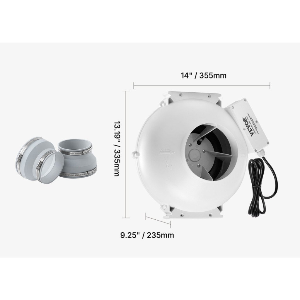 A készlet tartalmazza a szereléshez szükséges kiegészítőket: rugalmas PVC-csatlakozó adaptereket, univerzális rögzítő konzolt, valamint egy U-alakú nyomásmérőt, melynek segítségével valós időben ellenőrizhető a rendszer teljesítménye. A ventilátor teljesen zárt, víz- és porálló házzal rendelkezik, így beltéren és kültéren egyaránt biztonsággal telepíthető – akár vízszintesen, akár függőlegesen.
