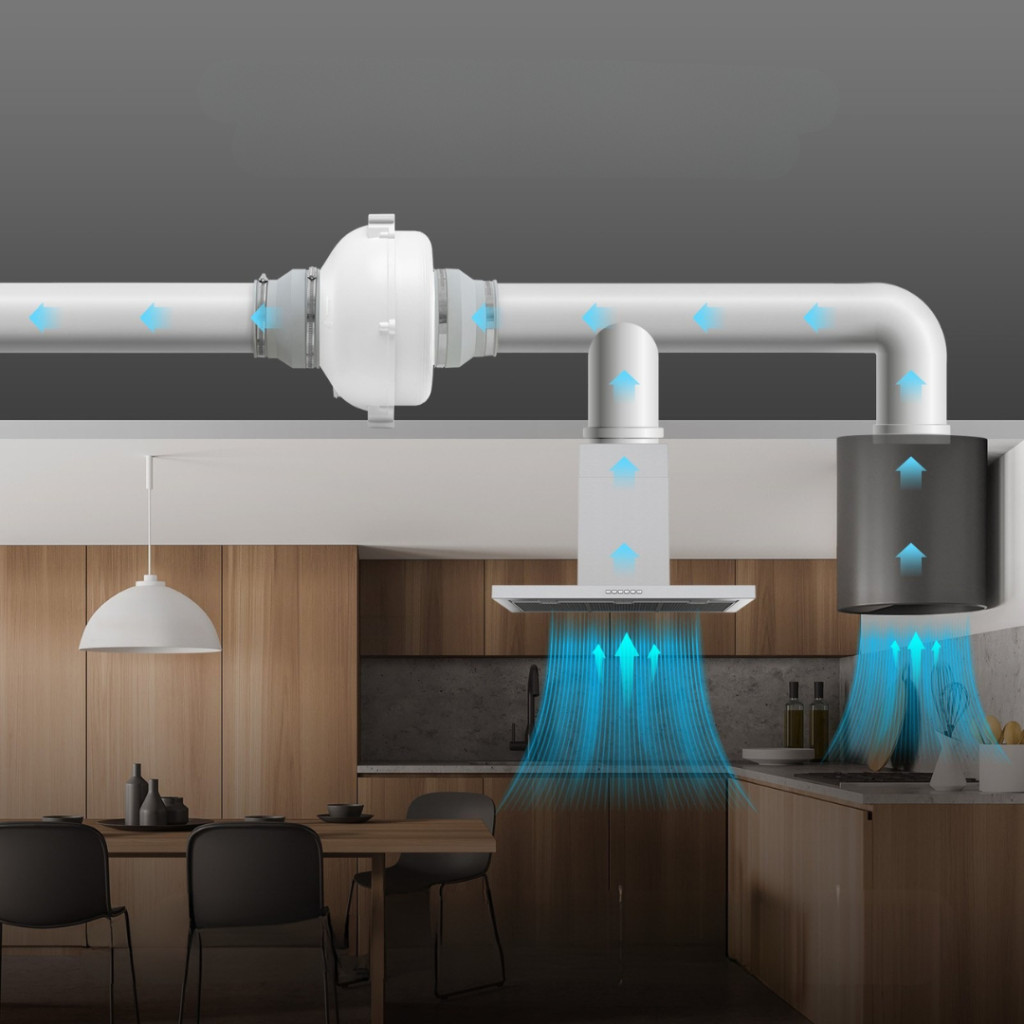 Nagy teljesítményű radonelszívó csatornaventilátor – 380 CFM légáram, 148–114 mm csatlakozó, csendes, vízálló, nyomásmérővel
