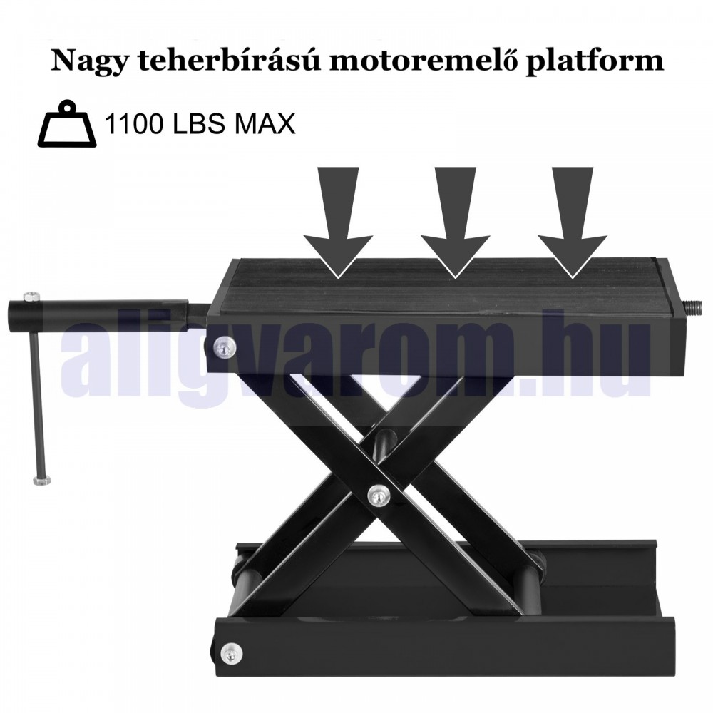 A motorkerékpár ollós emelő kiváló, körülbelül 498 kg teherbírású, így szinte bármilyen motorkerékpárt fel tud emelni. Lapos és széles platformmal is fel van szerelve, amely egyenletesen képes megtartani a kerékpár súlyát.
