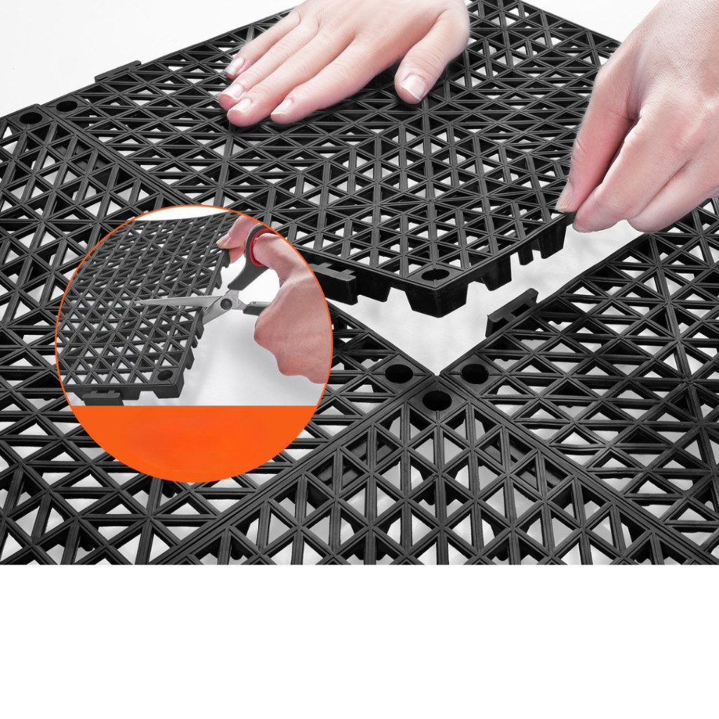 A lapok minőségi, rugalmas PVC-ből készülnek, amely ellenáll a vegyszereknek, olajnak, hajszálaknak és a gyakori használat okozta terhelésnek. A precízen illeszkedő vízelvezető nyílások megbízható stabilitást biztosítanak, így a lapok nem mozdulnak el, és hosszú időn át megőrzik formájukat.