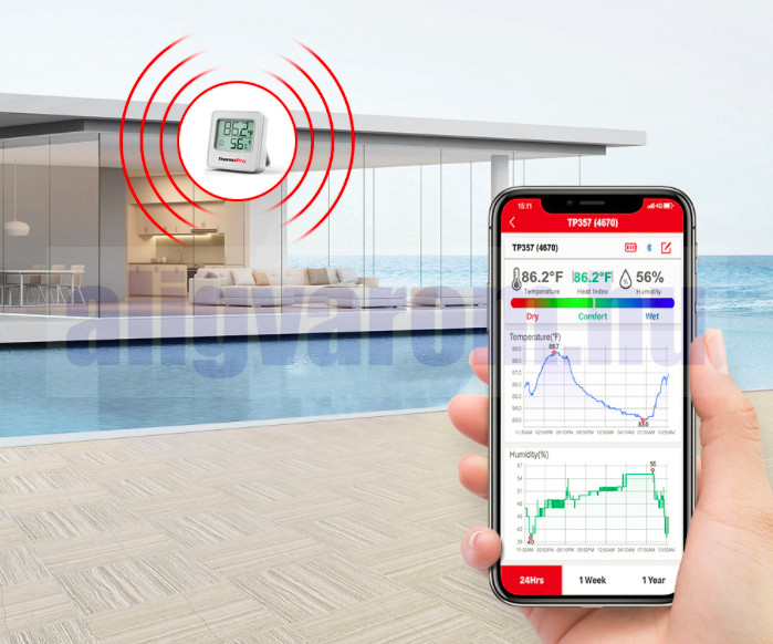 A hőmérő és páratartalommérő 2,4 GHz-es Bluetooth vezeték nélküli funkcióval van felszerelve és egy Bluetooth alkalmazáson keresztül csatlakozik az okostelefonhoz. Mostantól okostelefonjáról ellenőrizheti a nappali, hálószoba vagy üvegház hőmérsékletét és páratartalmát.