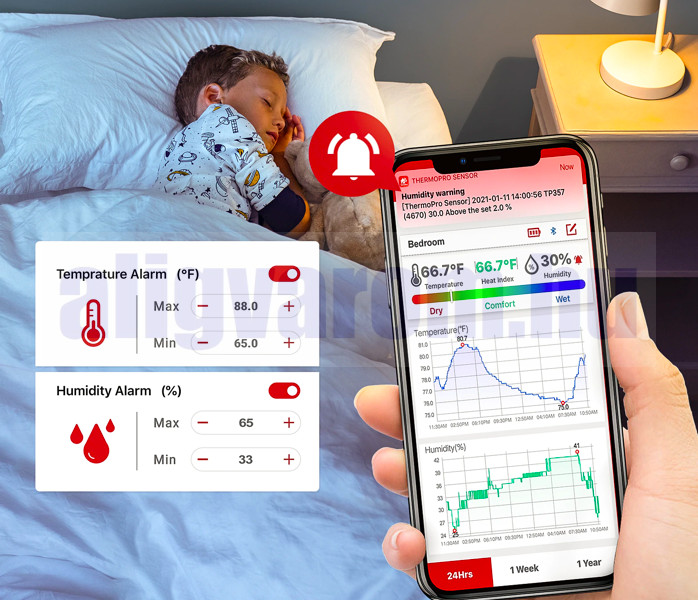 A hőmérséklet és a páratartalom tartománya a telefonos alkalmazásban állítható be. Amint a dátum a megadott tartományon kívül esik, a telefon értesítést kap.