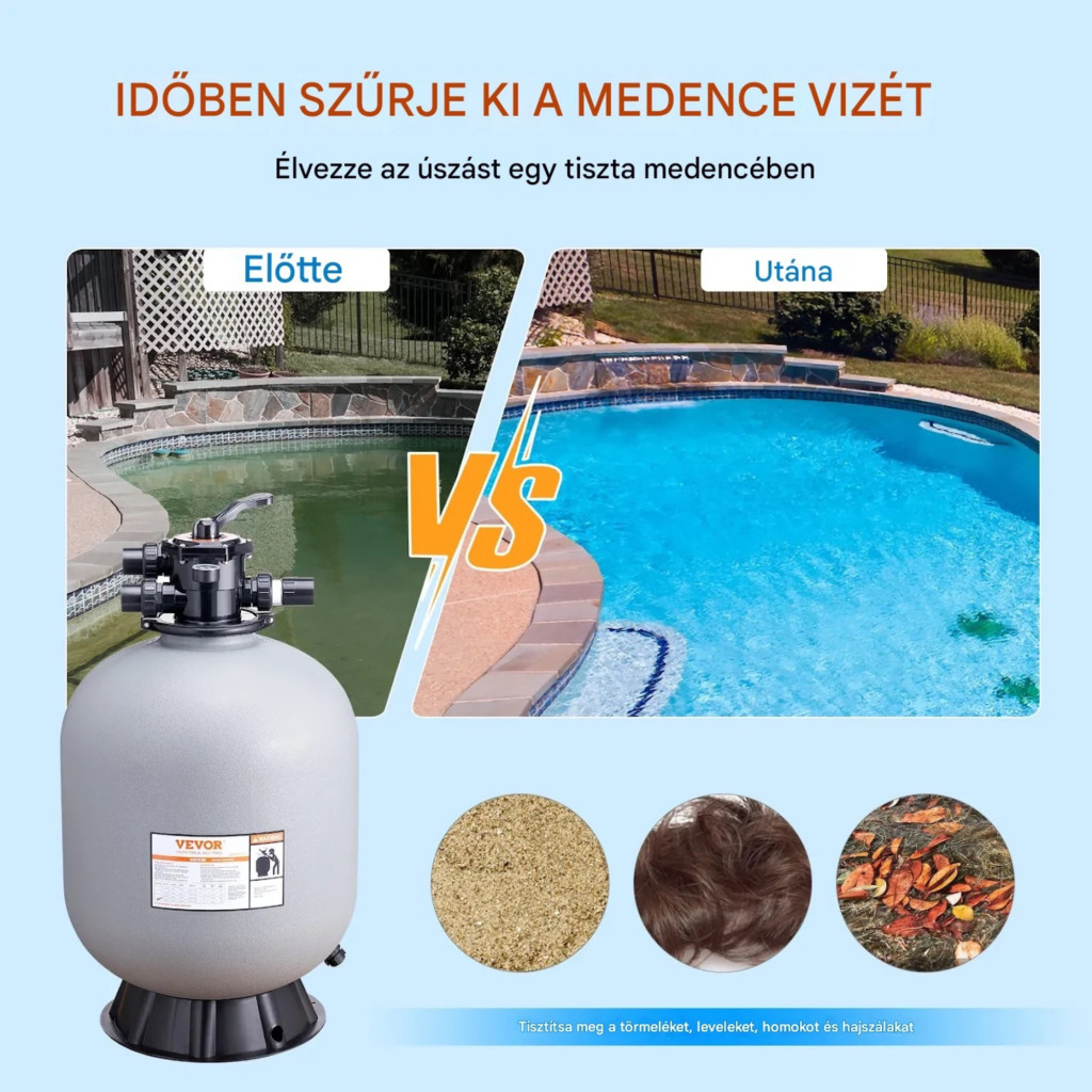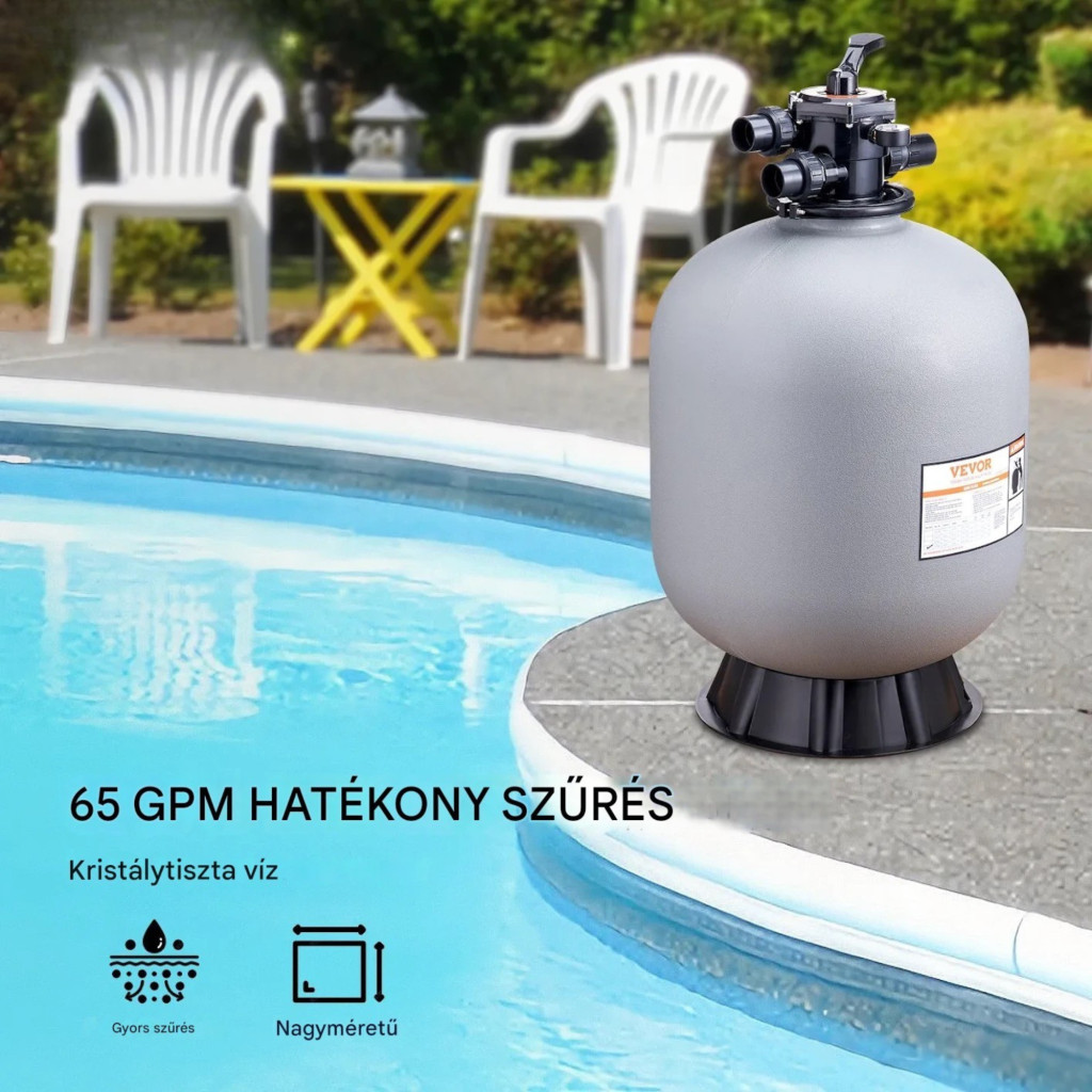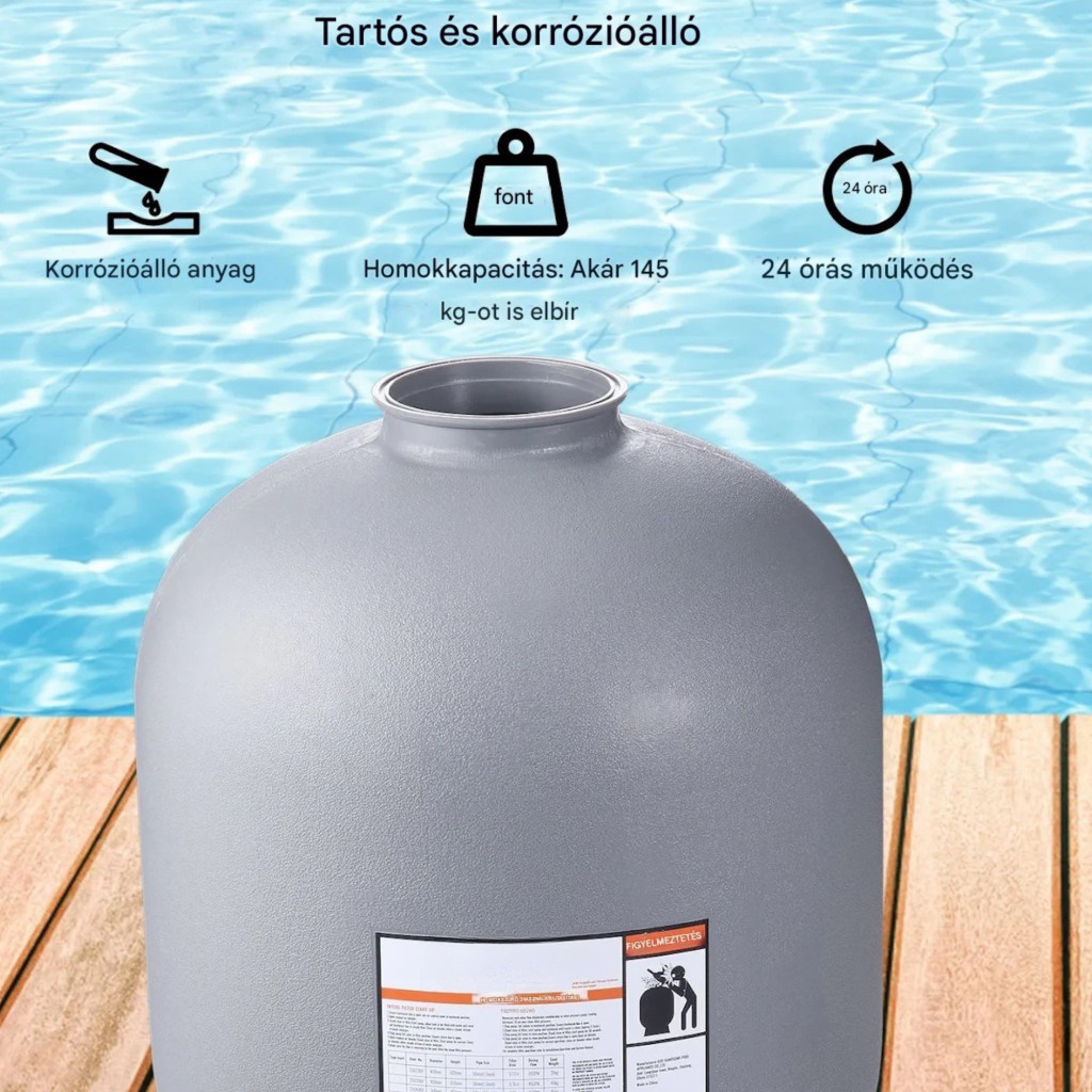 Ha Ön megbízható és nagy teljesítményű megoldást keres a víz tisztán tartására, ez a professzionális homokszűrő berendezés ideális választás. A nagy kapacitású rendszer hatékonyan távolítja el a szennyeződéseket, így Ön minden alkalommal tiszta, frissítő vízben élvezheti a fürdőzést.