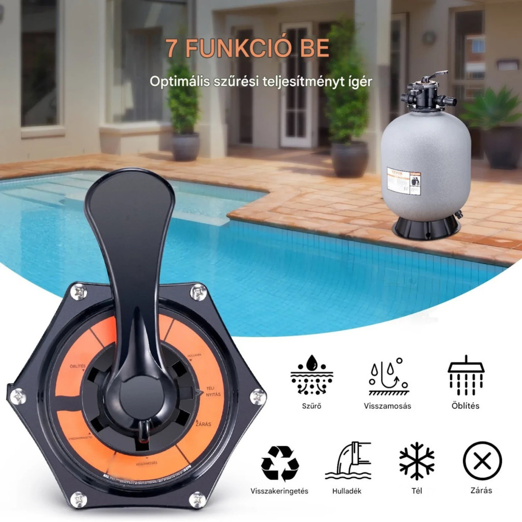 Homokszűrős vízforgató 609,6 mm tartállyal 65 GPM, 7 funkciós többjáratú szelep
