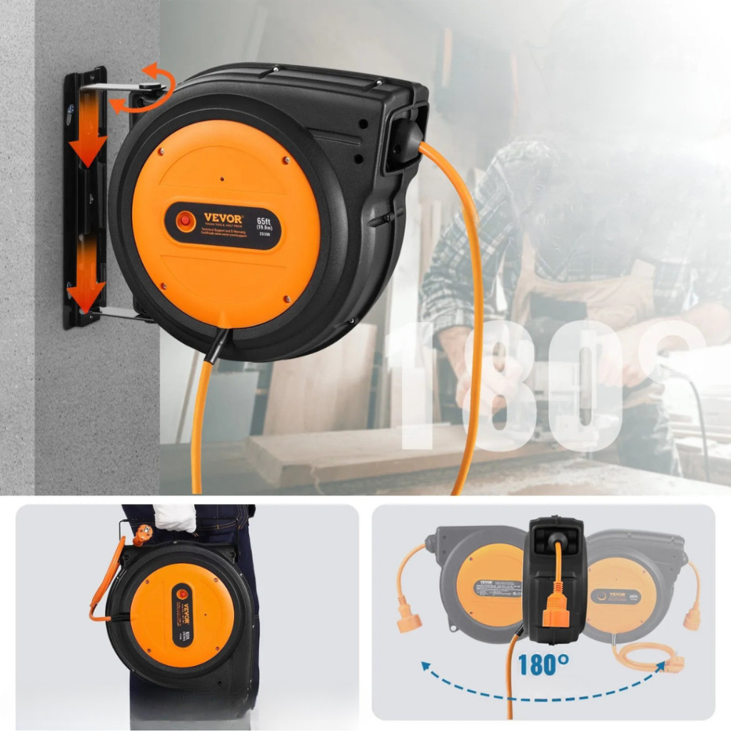 Fali automata ipari kábeldob 19 méteres hosszabbítóval – 1600 W teljesítmény 2,5 mm² kábel, 180°-ban forgatható fali konzol, IP-védett
