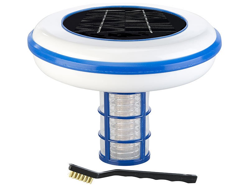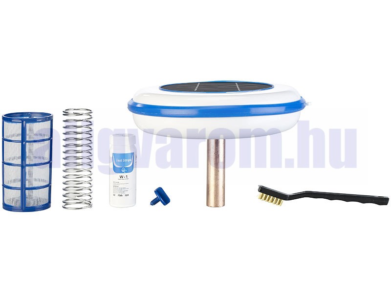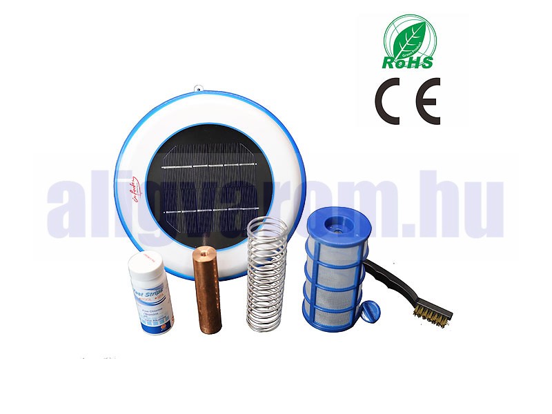 A medence ionizátorának tetejét napelemek borítják. Az ionizátor a napfényt használja a rézionok aktiválására, amelyek segítenek a medencevízben lévő baktériumok elleni küzdelemben. Ezenkívül a rézionok csökkentik az algák kialakulását. Mindig tiszta vizet élvezhet!