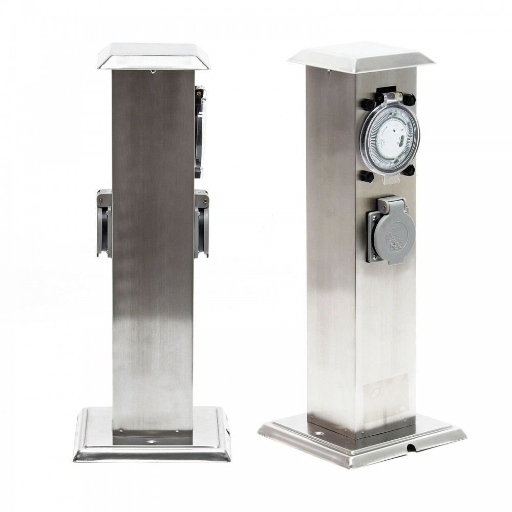 Rozsdamentes kerti konnektor dupla aljzat időzítővel, 40 cm magas inox szögletes alakú kültéri elosztó