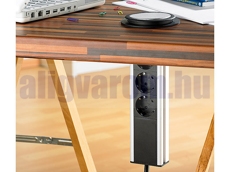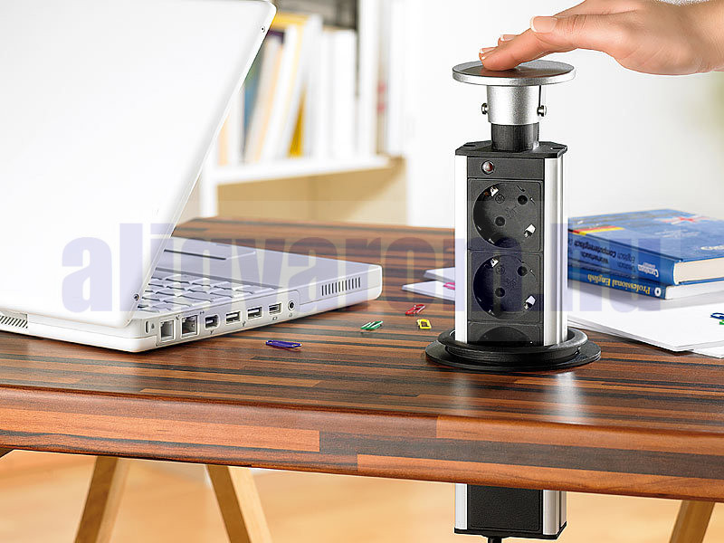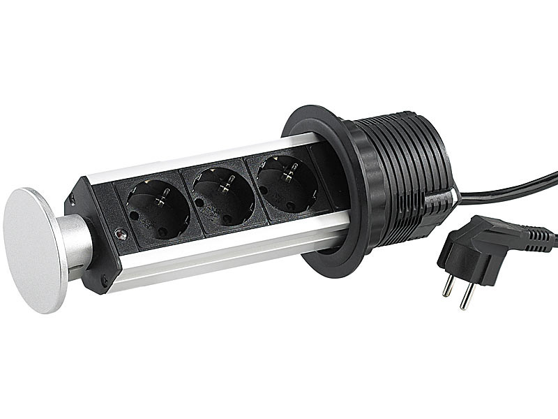 Vessen véget az összegabalyodott hosszabbítókábeleknek! Ideális konnektor az irodába, a konyhába de akár a műhelybe is! Az íróasztalba, munkalapba vagy munkapadba süllyesztve az elosztó nem foglal helyet. Elég egy könnyed mozdulat és máris kinyithatja, ha szüksége van konnektorra, és ugyanilyen könnyen lesüllyeszthető. A teljesen visszahúzható, 3 aljzattal ellátott asztali konnektor láthatatlan, de mindig ott van, amikor áramra van szüksége.