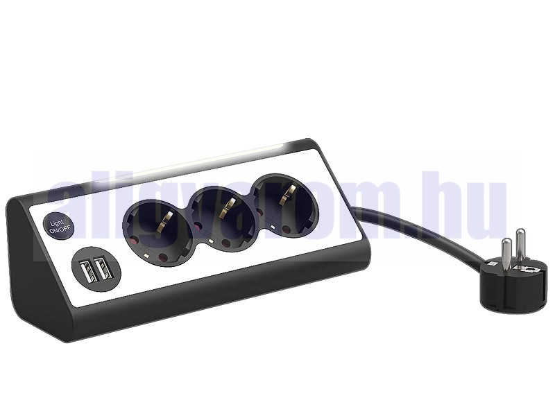 Hálózati konnektor 3 aljzattal 2 USB töltőporttal és LED éjszakai világítással beltéri elosztó