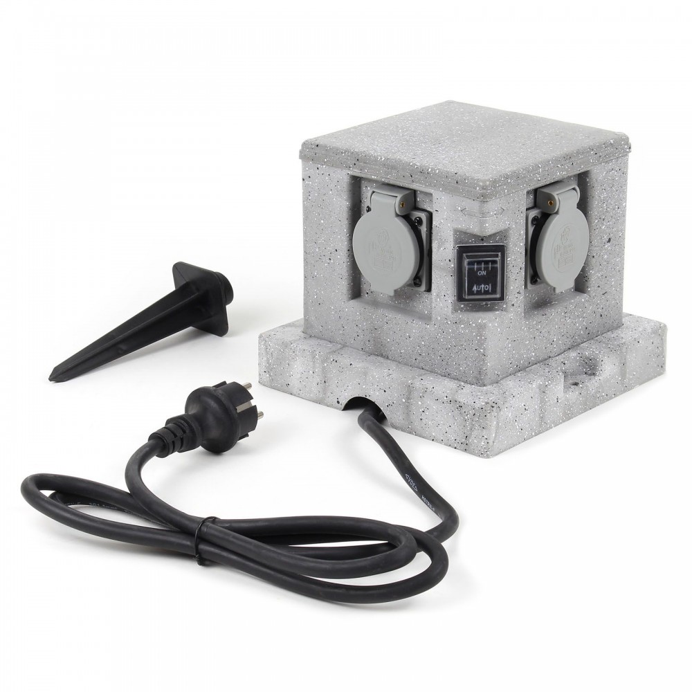A formás, gránit megjelenésű ház feltűnésmentesen illeszkedik a kertbe. Az IP44 szabványnak köszönhetően ez a kültéri konnektor könnyen ellenáll az esőnek és a víznek. A négy aljzat kissé megemelve és biztonságosan egy mágneszárral biztosított csuklós ajtó mögött helyezkedik el. A kocka alakú termék mindkét oldalán egy-egy aljzat található.