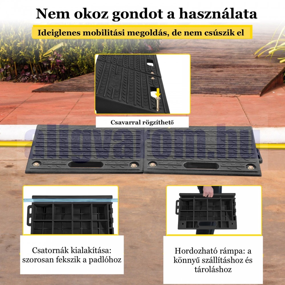 A gumirámpa könnyedén telepíthető. A 4 előfúrt rögzítőfurat a szükséges csavarokkal ideális számos ideiglenes, hordozható és állandó mobilitási megoldáshoz. Remekül bírja a különböző terheket, mint pl. a kerekesszékeket és robogókat, autókat.