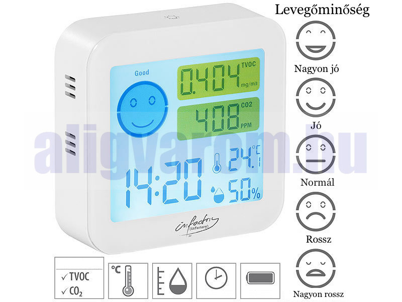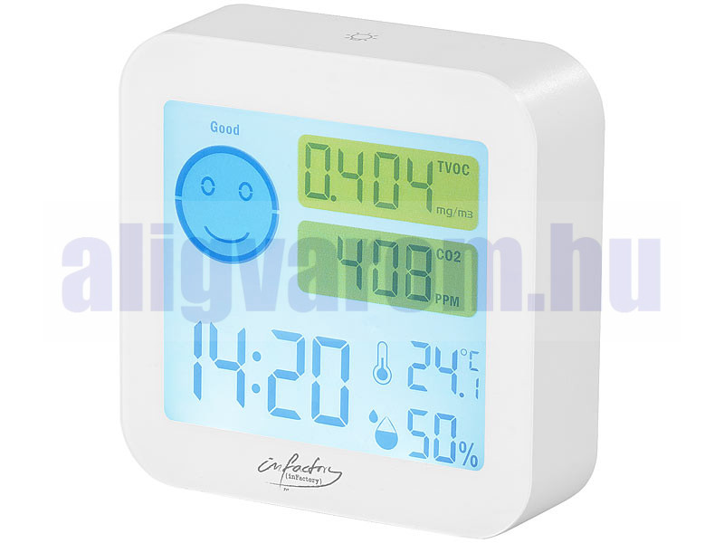 Mostantól mindig szemmel tarthatja a beltéri levegő minőségét ezzel a légszennyezettség mérőműszerrel! A mérőműszer a szén-dioxid (CO2) mellett az összes illékony szerves vegyület (röviden TVOC) koncentrációját is méri. Megjeleníti a vonatkozó mérési eredményeket külön értékekkel.
