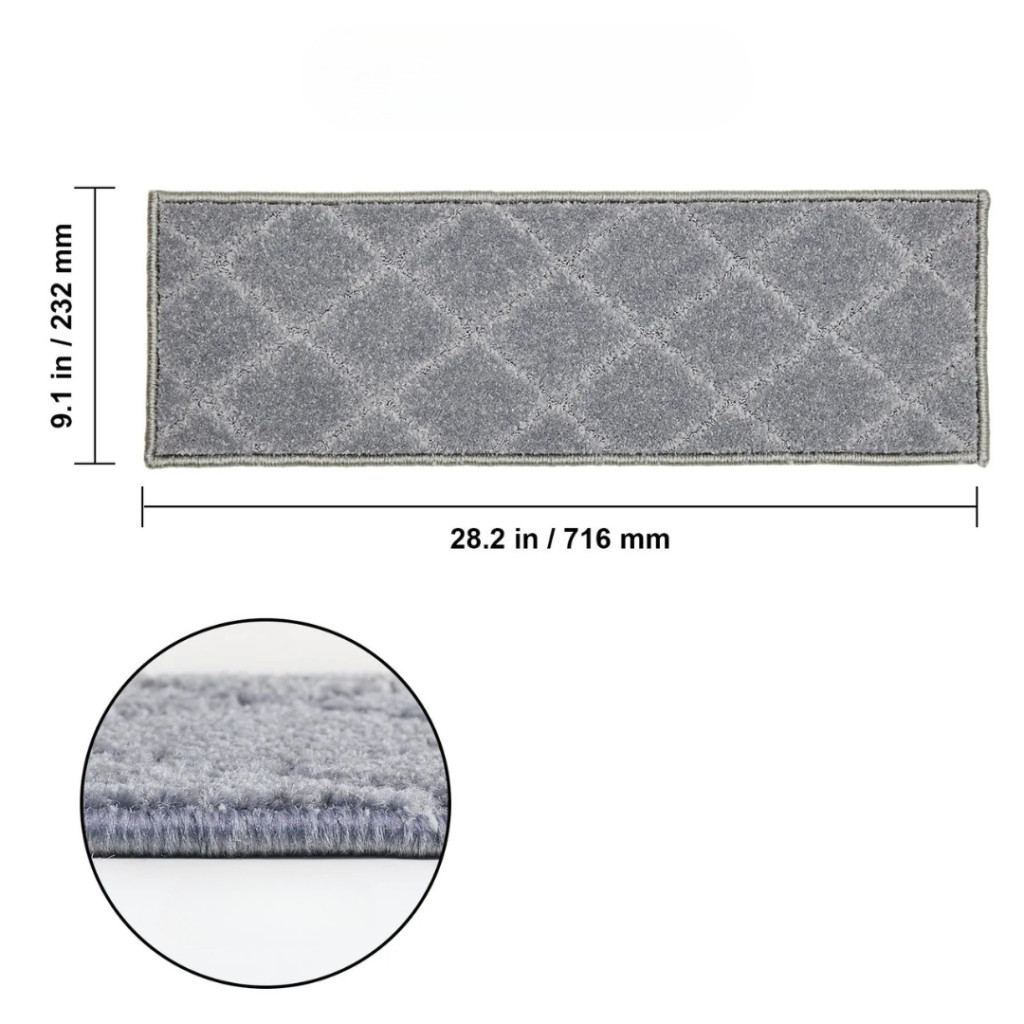 A szett 15 darab lépcsőszőnyeget tartalmaz, mindegyik mérete 71,6 × 23,2 cm, vastagsága pedig 11 mm. Ez a szabványos méret jól illeszkedik a legtöbb lépcsőtípushoz. Használható fa-, csempe-, kő-, fém- vagy üvegfelületen, így sokoldalú megoldást kínál.