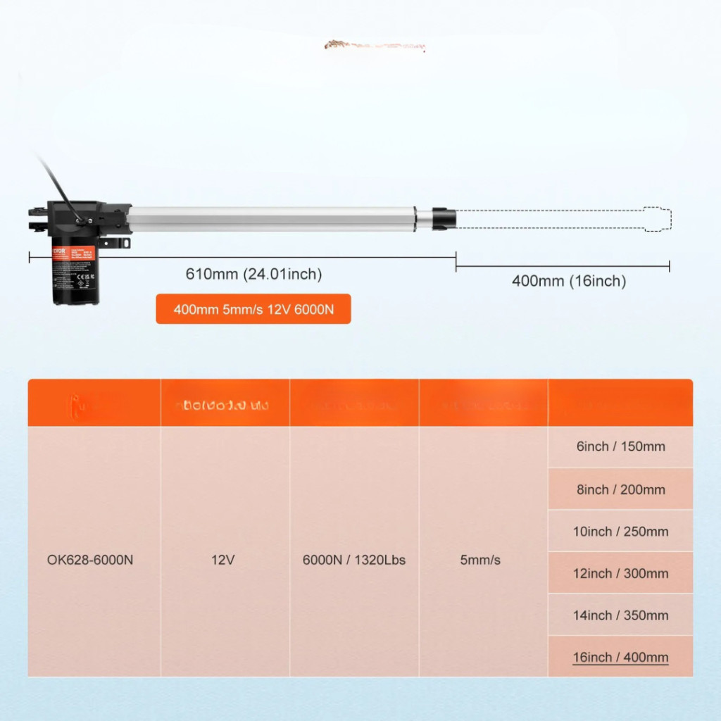 12V lineáris aktuátor 6000 N tolóerő 400 mm löket, 5 mm/s sebesség, IP44 védelemmel, ≤50 dB zajszint
