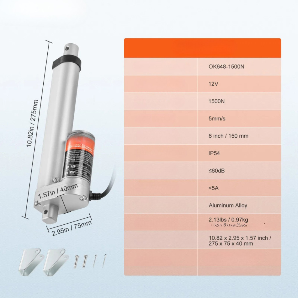 A 12V lineáris aktuátor megbízható és precíz elektromos mozgatóberendezés, amely ideális automatizálási, ipari és otthoni alkalmazásokhoz. A 1500 N (≈150 kg) tolóerő és a 5 mm/s sebesség pontos mozgásvezérlést biztosít, míg az IP54-es védelem garantálja a biztonságos működést poros vagy enyhén nedves környezetben. Kiváló választás robotikai rendszerekhez, elektromos ágyakhoz, szellőzők és ajtók működtetéséhez, valamint ipari gépekhez és laborberendezésekhez.