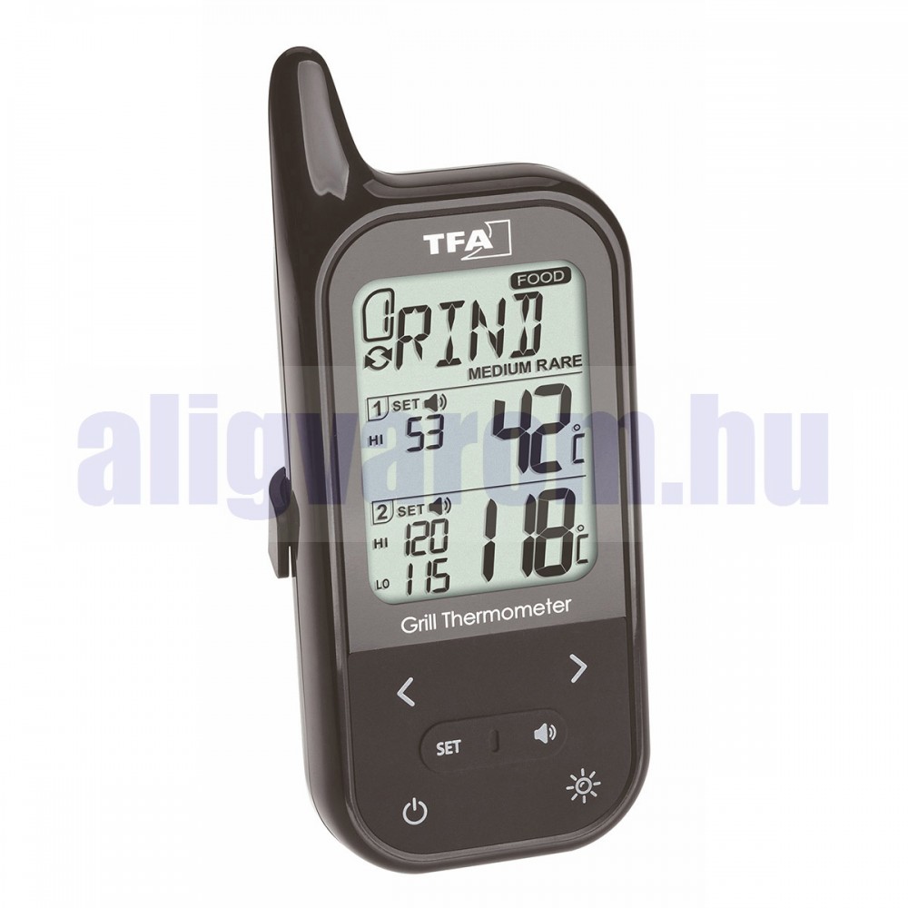 Jeladó két nemesacél beszúró-érzékelővel, rádiójel hatótávolsága max. 100 m. Így választhatóan figyelhető vagy a grillsütő vagy a sütőtér-hőmérséklete vagy maximum két sült vagy grillezett húsdarab hőmérséklete.
