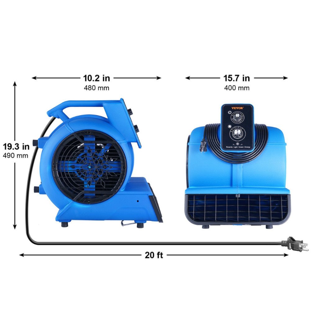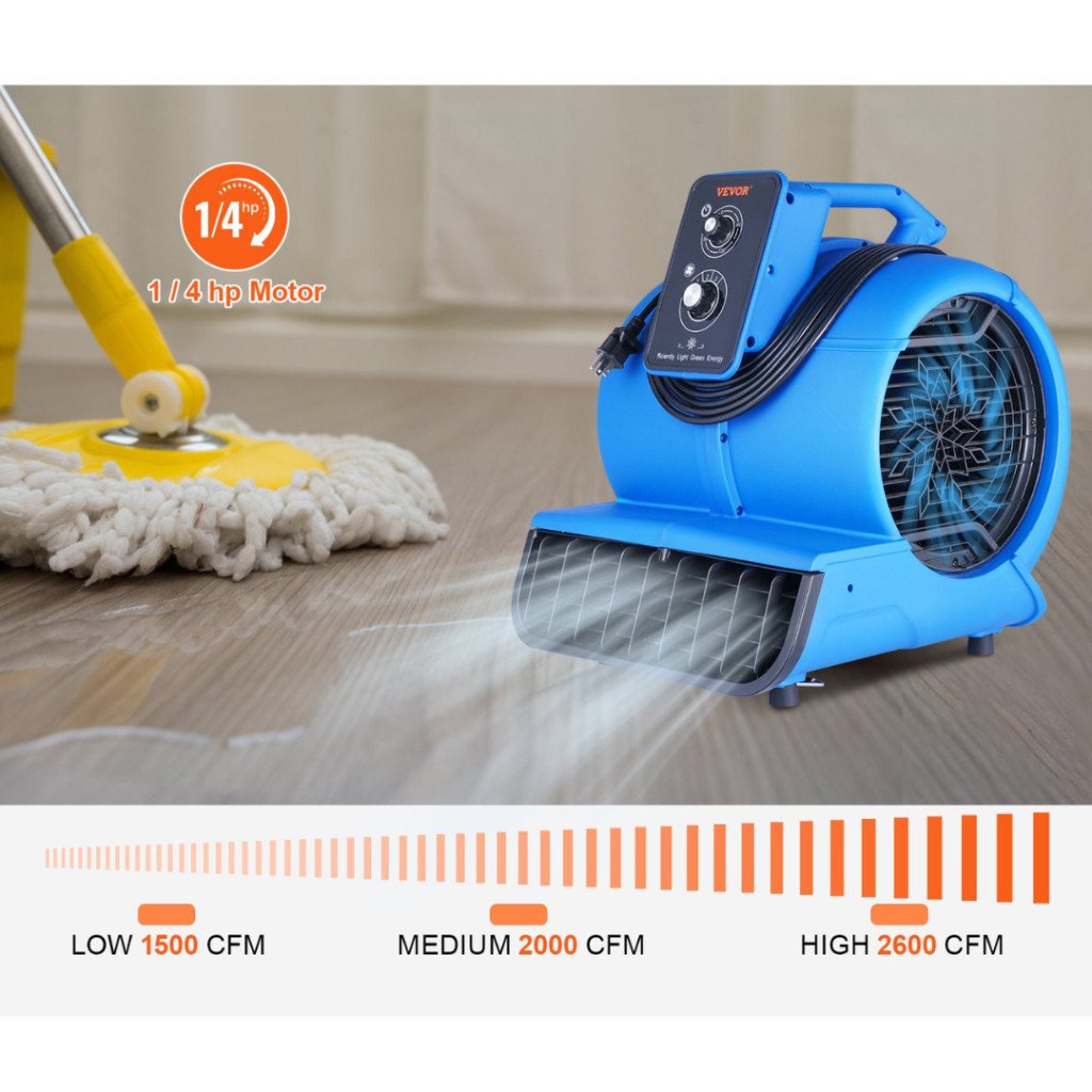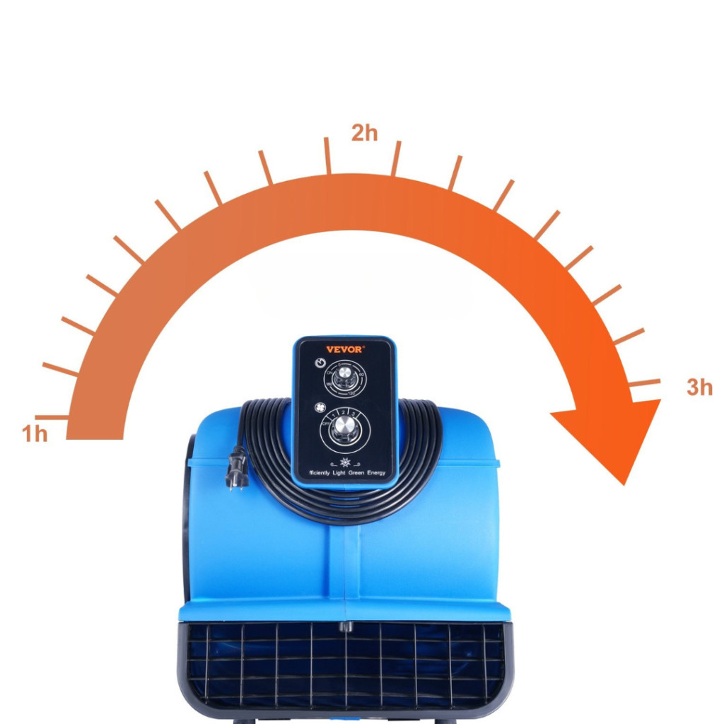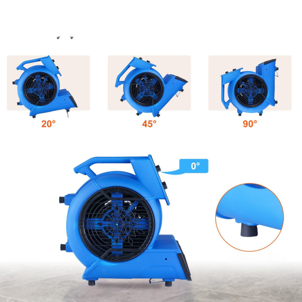 A három választható sebességfokozat (1500 / 2000 / 2600 CFM) révén könnyedén szabályozhatja a légáramot a kívánt intenzitásnak megfelelően. A négy különböző fúvószög (0°, 20°, 45°, 90°) lehetővé teszi, hogy a levegő pontosan oda áramoljon, ahol arra a legnagyobb szükség van – legyen szó padlóról, falról vagy mennyezetről. A beépített 3 órás időzítő segít abban, hogy ne kelljen aggódnia a kikapcsolás miatt, miközben Ön más dolgokra koncentrál.