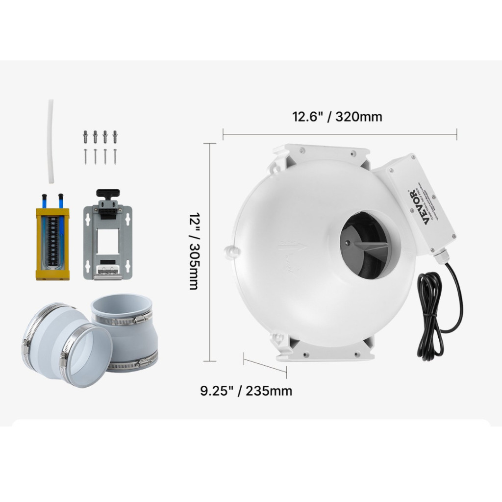 Radoncsökkentő csőventilátor rendszer – 98–89 mm átmérő, 260 m³/h légszállítás, csendes működés, nyomásmérővel, kültéri használatra is alkalmas