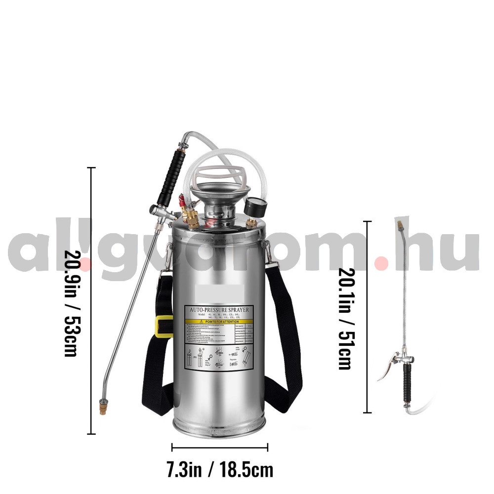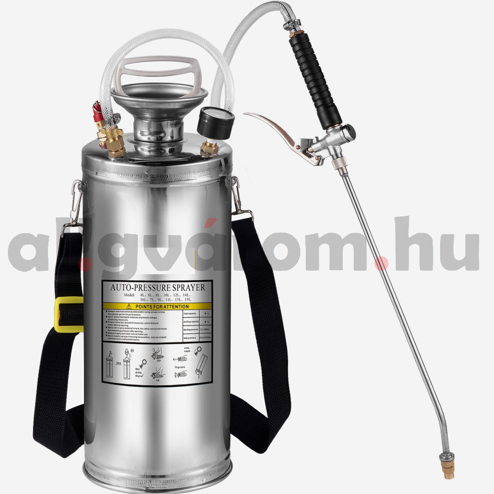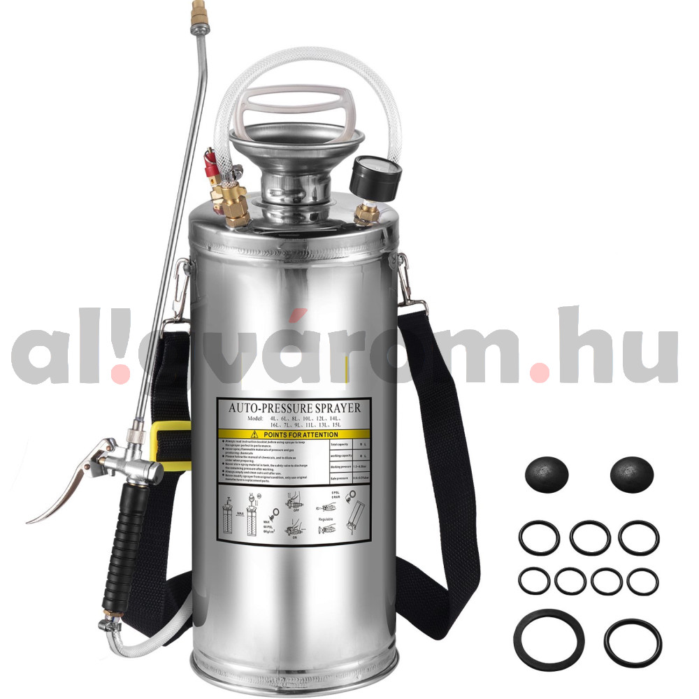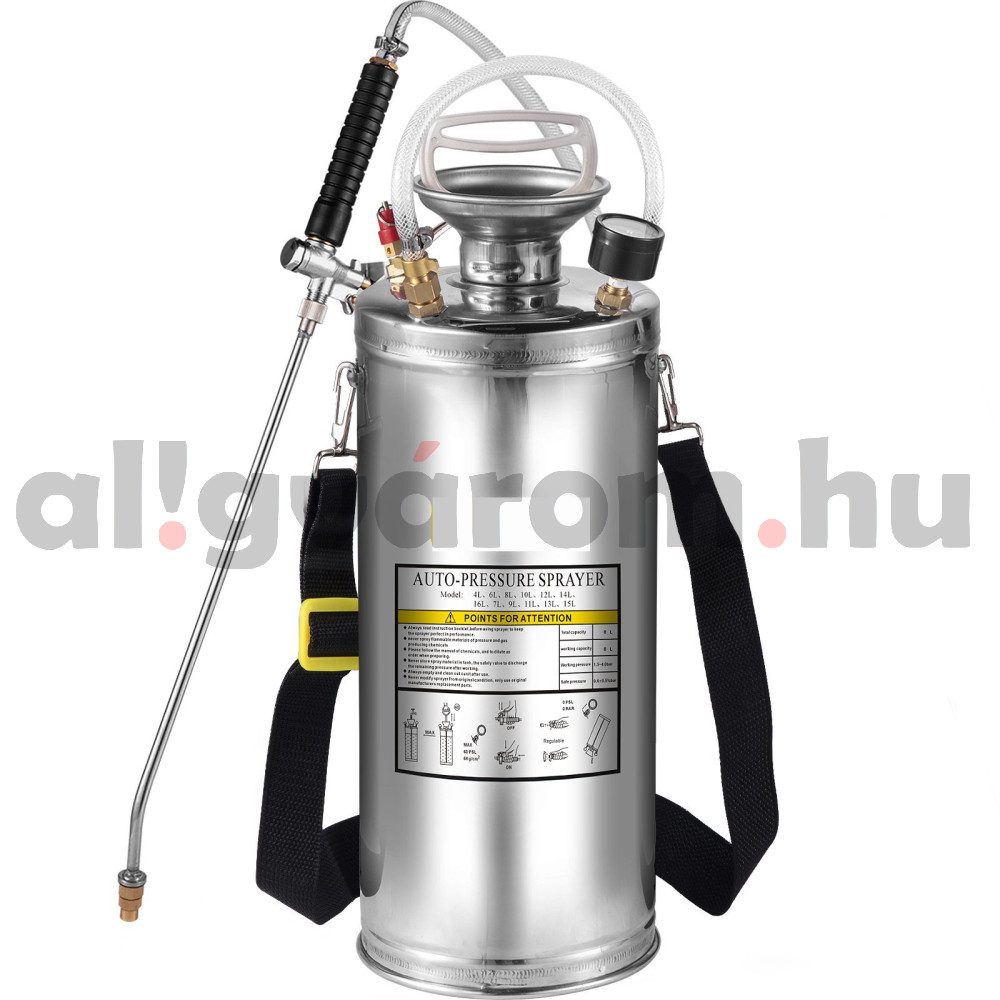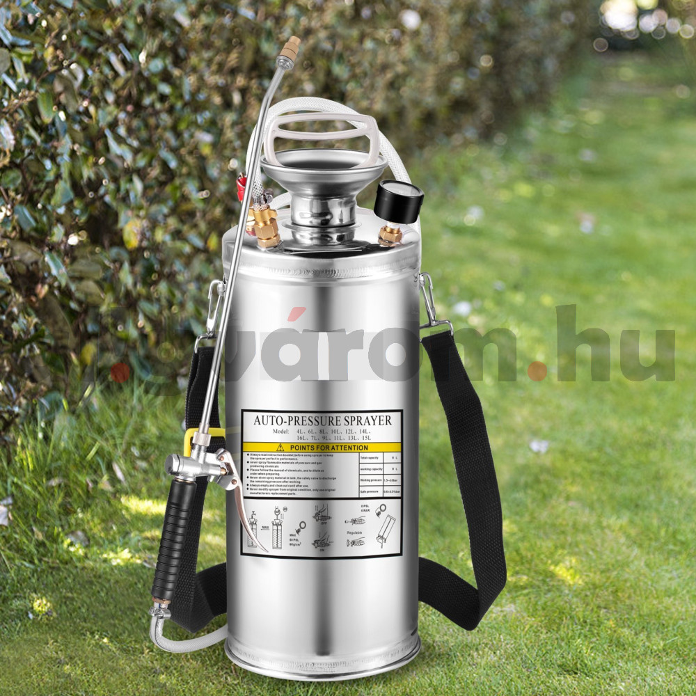 Rozsdamentes acélból készült 8 literes permetezőgép.