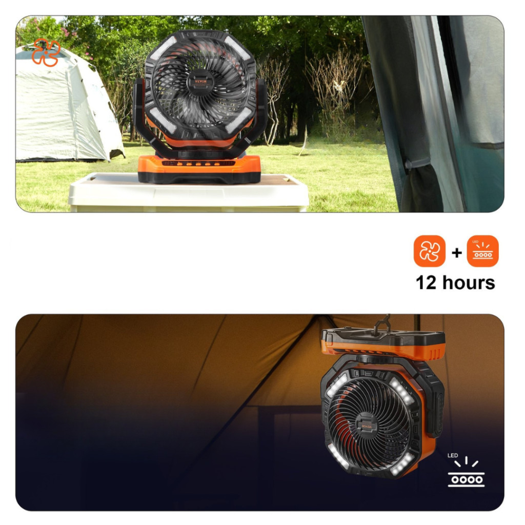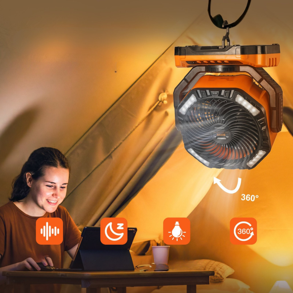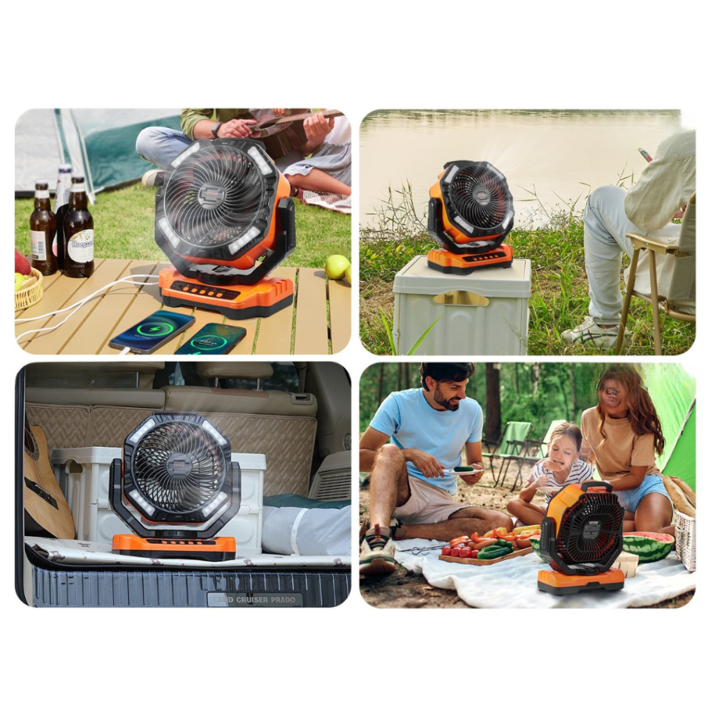 Ez a kompakt, mégis rendkívül nagy teljesítményű asztali ventilátor egyesíti a hűtést, világítást és töltési lehetőségetegyetlen készülékben. A 40 000 mAh-s újratölthető akkumulátorral akár 136 órás működést is biztosít alacsony fokozaton, így tökéletes választás kempingezéshez, horgászathoz, utazáshoz vagy akár áramszünet esetére is. A négy sebességfokozat, a 360°-os manuális és 90°-os automatikus forgás, valamint a beépített LED lámpa három fényerőfokozattal gondoskodik a komfortos és rugalmas használatról.