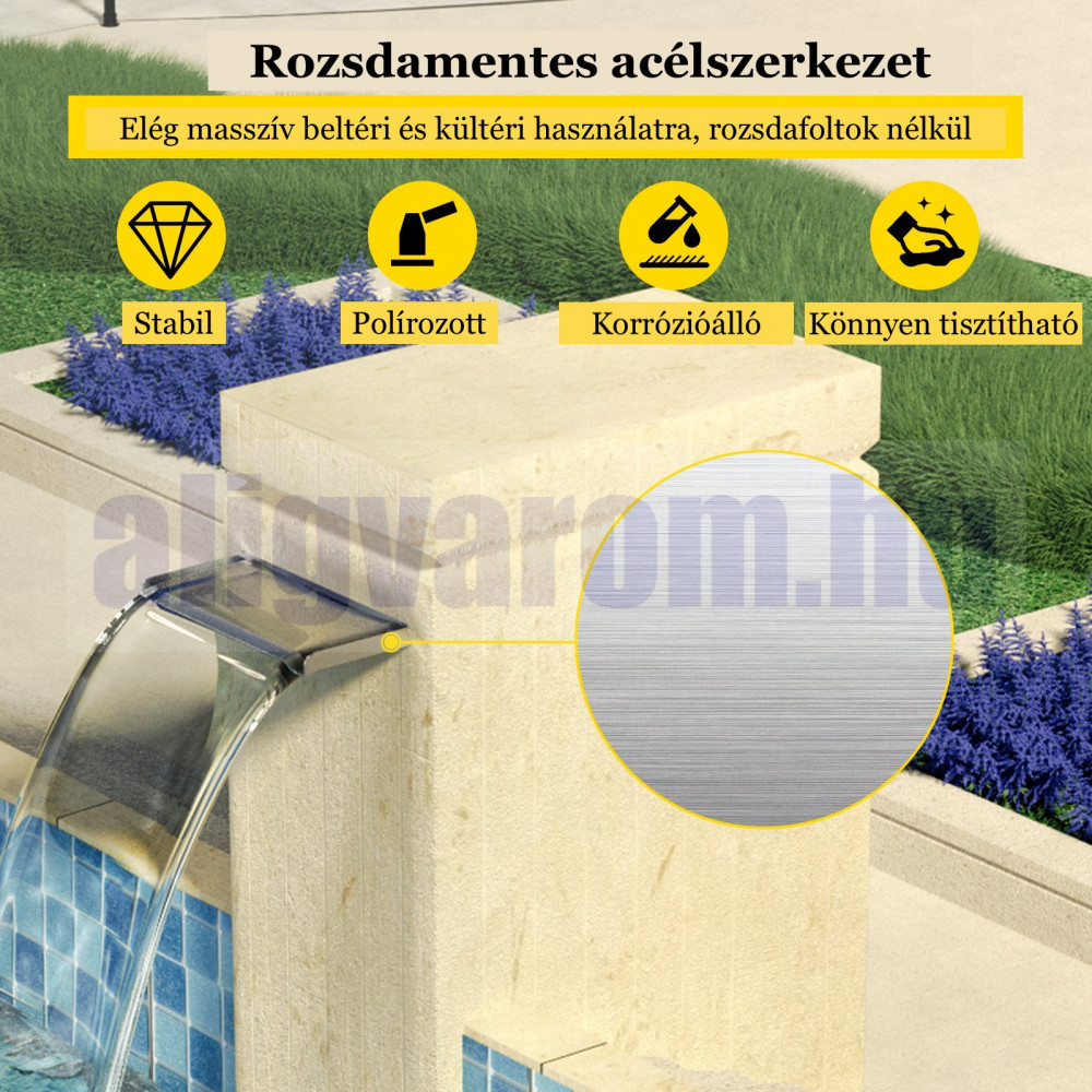 A házi vízesés rozsdamentes acélból készült, így robusztus és még jól is néz ki. A finom polírozásnak köszönhetően nincs szükség napi karbantartásra.