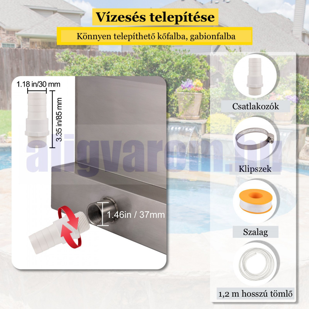 A medence vízesés teljes tartozékokkal érkezik, amelyek megkönnyítik a telepítést, beleértve a csatlakozót, a tömlőt, a bilincset és a PTFE-szalagot. Nemcsak szivattyúkhoz, hanem nyomás- vagy áramlásszűrőhöz is csatlakoztatható.