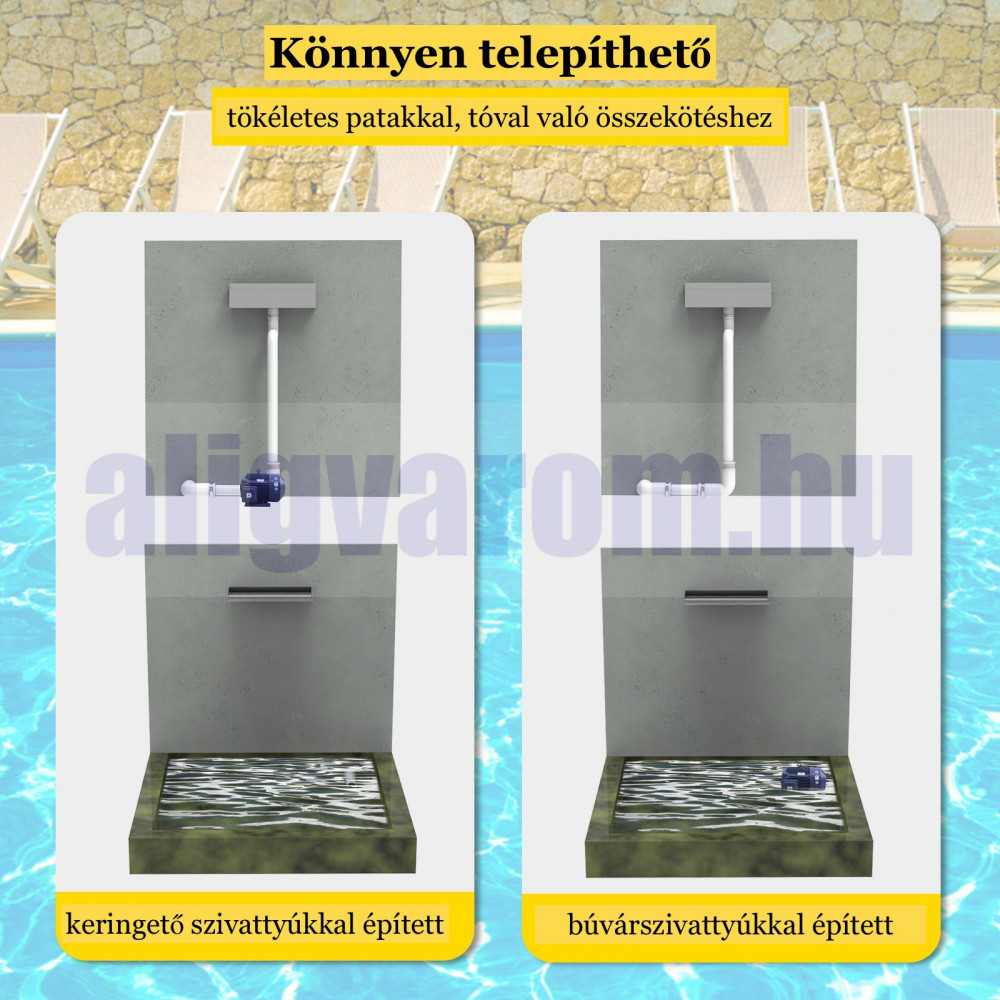 A vízeséssel fantasztikus vízjátékot hozhat létre kertjében, teraszán vagy udvarán. Rögzítheti a kőfalhoz, gabionhálós falhoz vagy tóhoz.