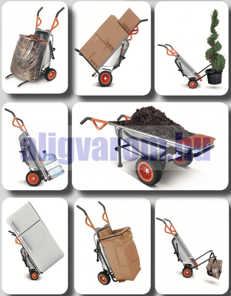 Lehet belőle zsákszállító, farönkszálltó, növényszállító, kőszállító, ládaszállító kerti kiskocsi.