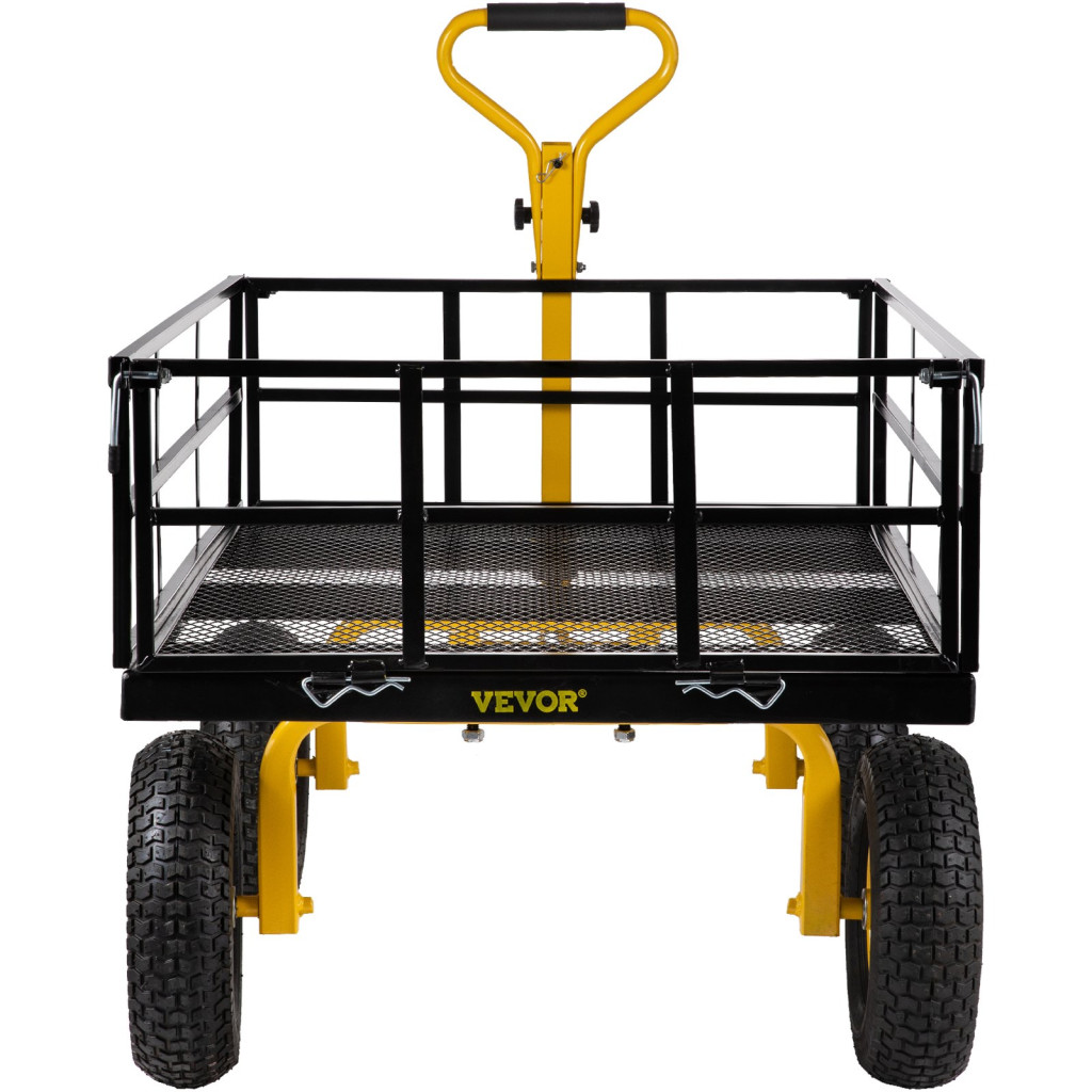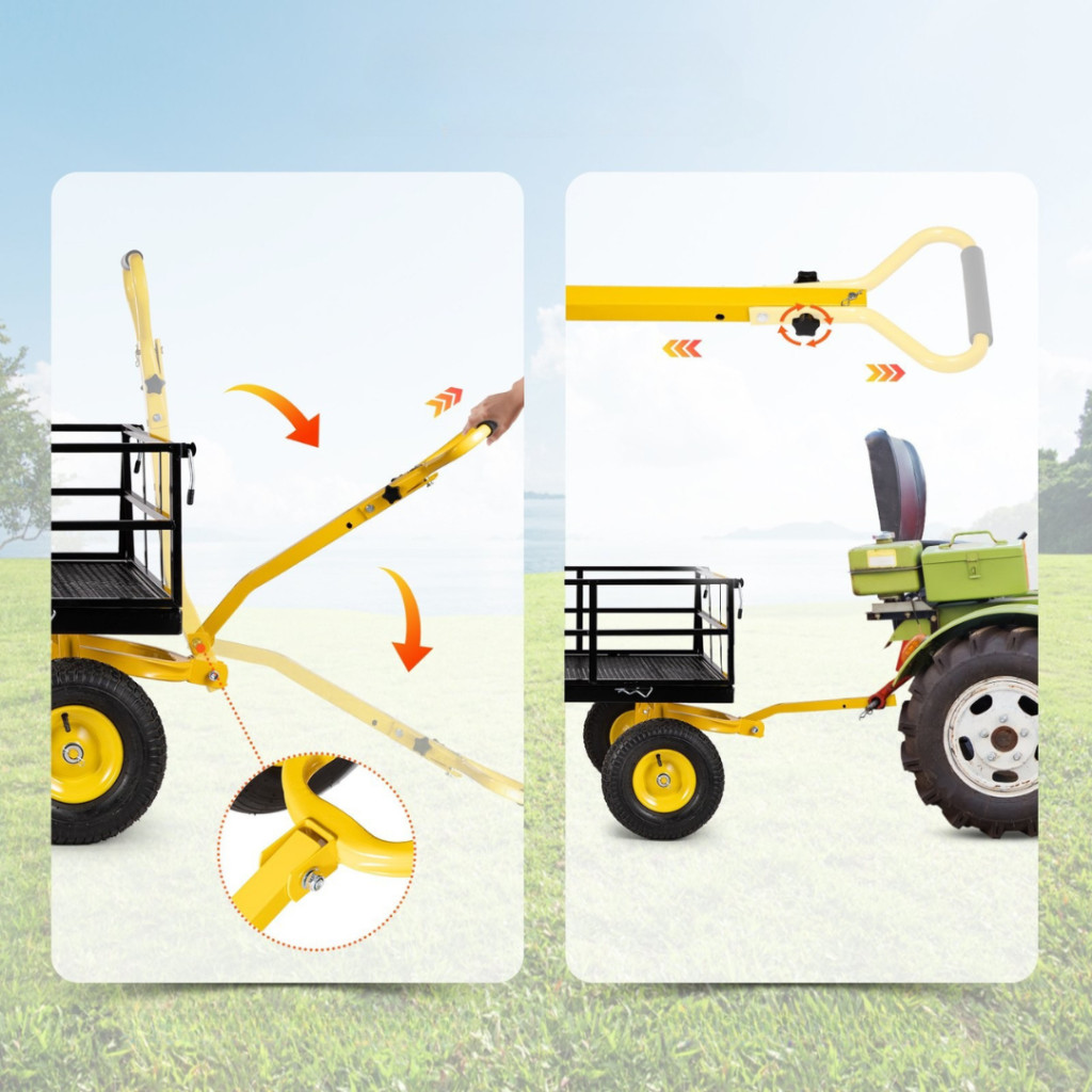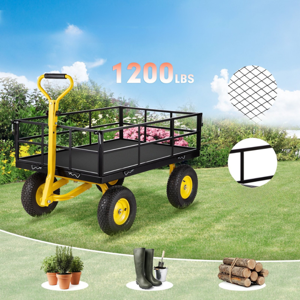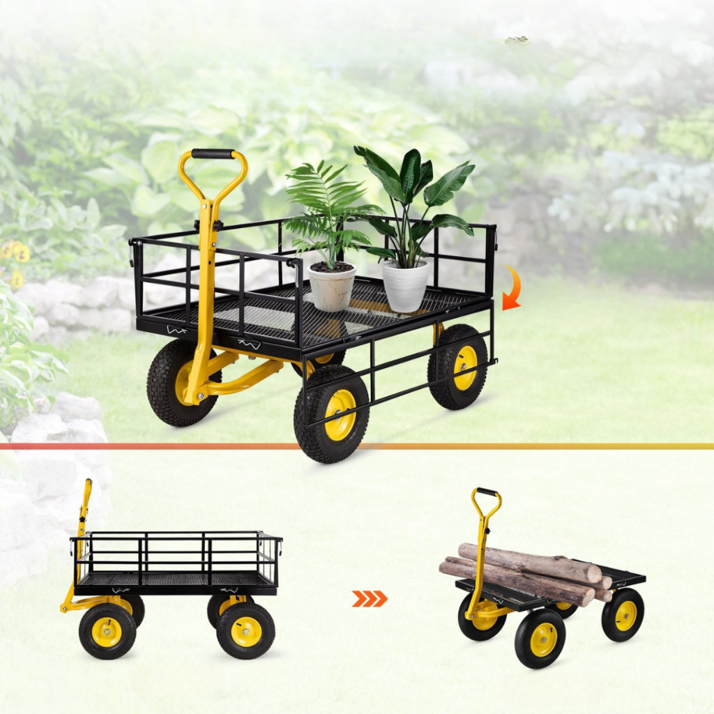 Nagy teherbírású acélvázas kerti szállítókocsi 112 x 75 cm-es rakfelülettel – 544 kg kapacitás, 33 cm átmérőjű gumikkal, 2 az 1-ben platós és rácsos kialakítás, vontatható markolattal