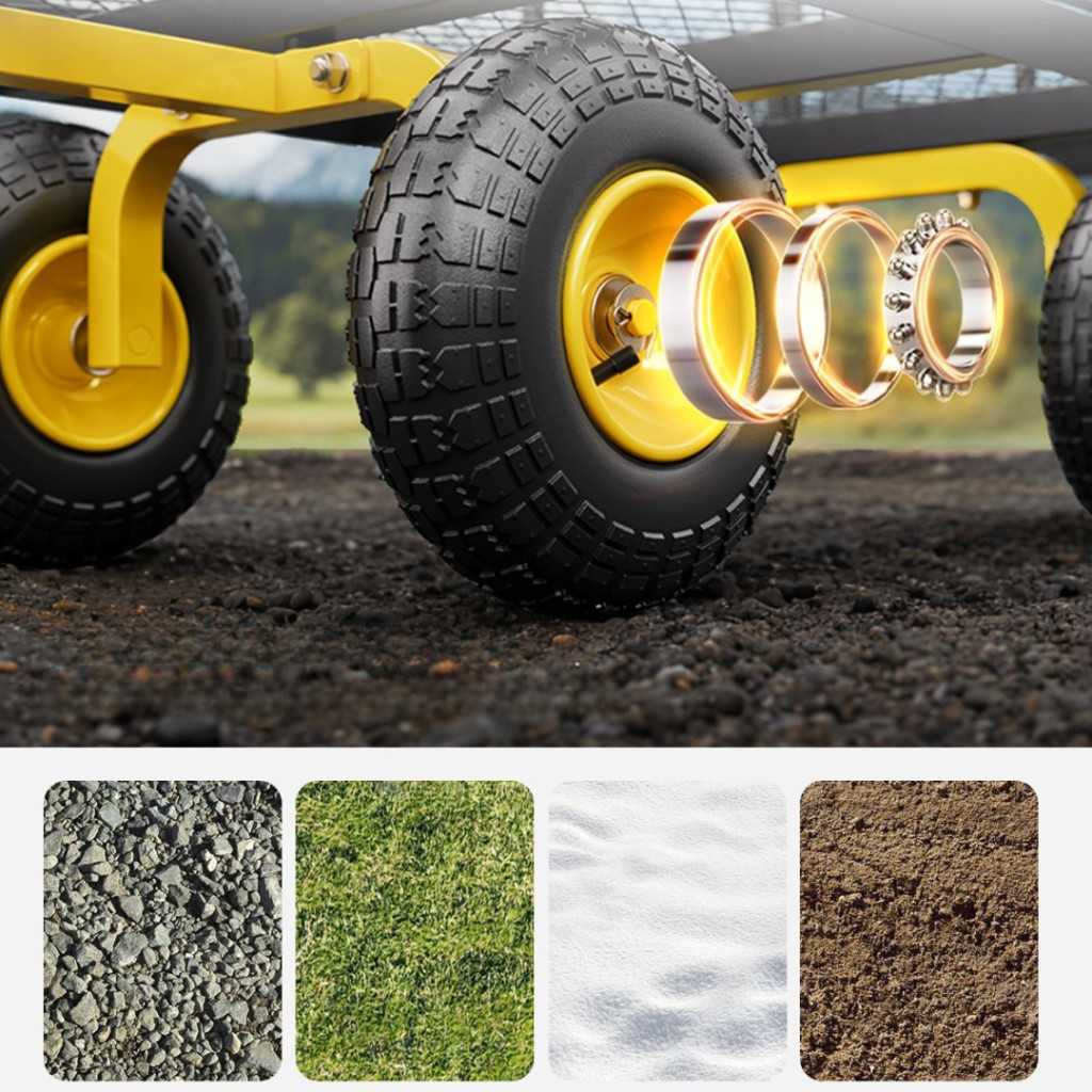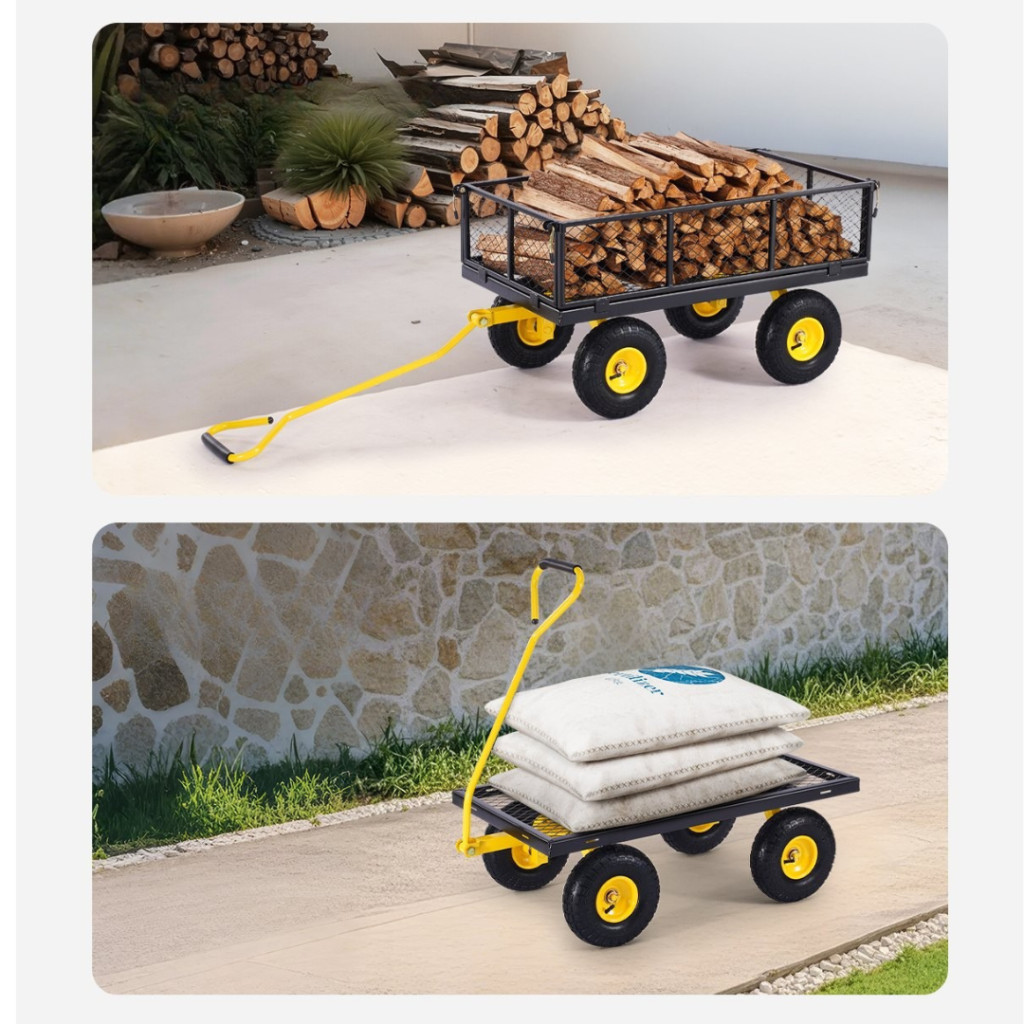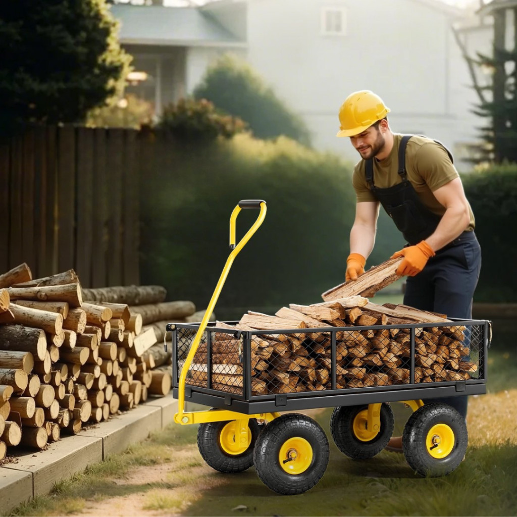 Nagy teherbírású acél kerti szállítókocsi – 408 kg kapacitás, 965 x 560 x 535 mm-es kialakítás, 25,5 cm gumikkal, platós vagy rácsos üzemmóddal, kültéri kézikocsi kerti munkákhoz
