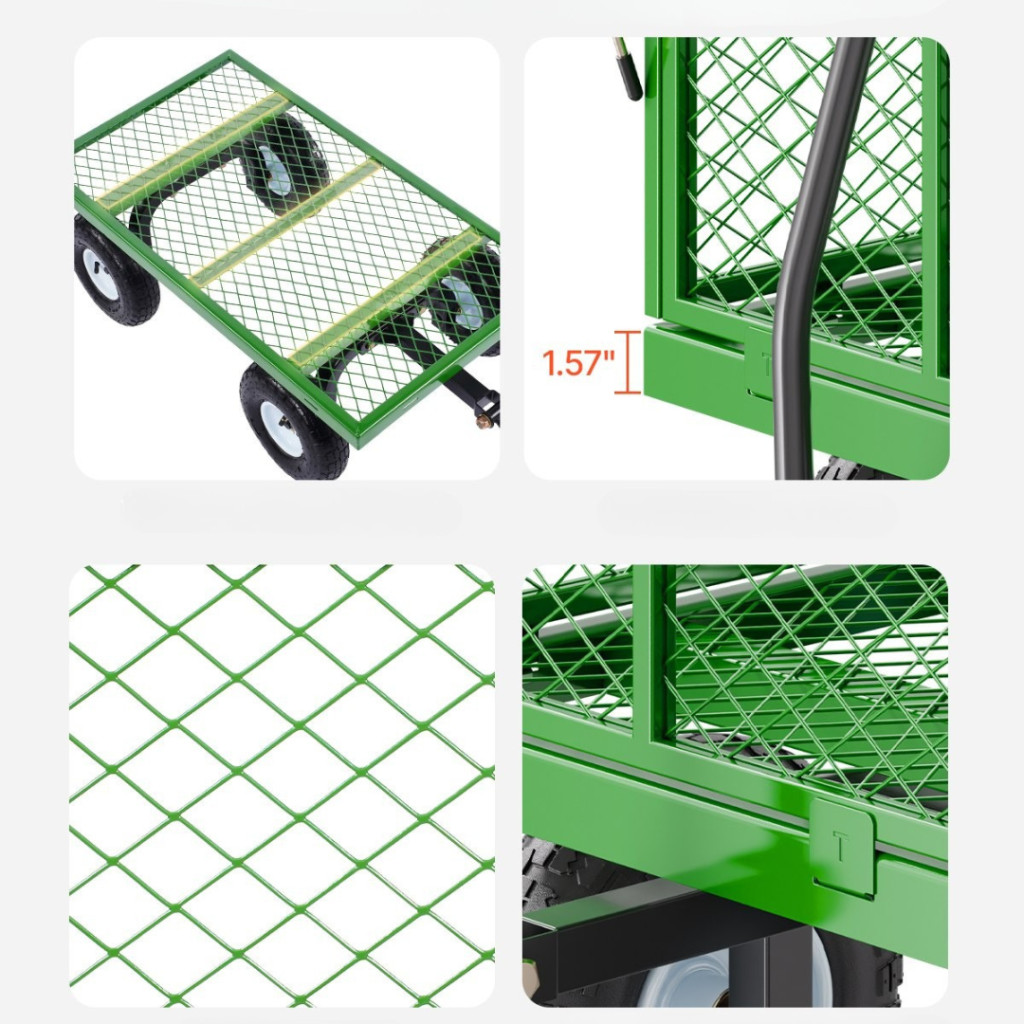 A 2 az 1-ben kialakításnak köszönhetően a kocsi oldalfalakkal és nyitott platóként is használható. Ez különösen előnyös, ha laza ömlesztett anyagokat vagy nagyobb, szabálytalan alakú tárgyakat kell mozgatni. A Q235 acélváz három alátámasztó bordával és porszórt korrózióálló felülettel garantálja a hosszú távú, kültéri használhatóságot.