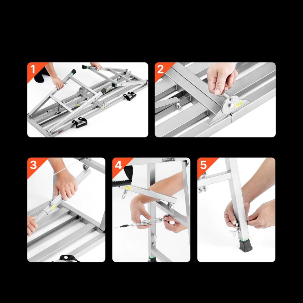 A platform néhány mozdulattal kinyitható és összecsukható, nincs szükség bonyolult szerelésre. Ez időt takarít meg, és különösen hasznos azoknak, akik rendszeresen mozgatják a munkaállványt különböző munkaterületeken.