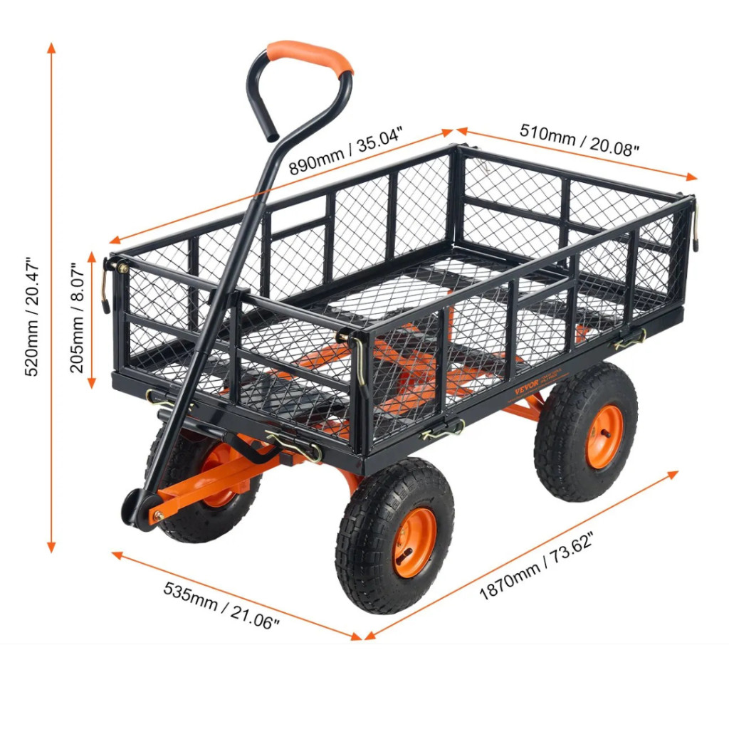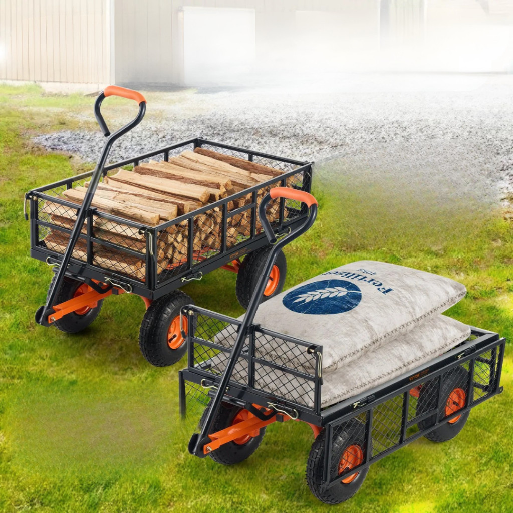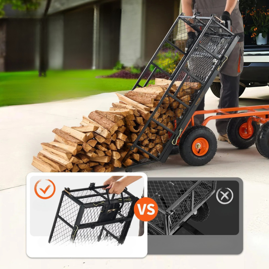 Nagy teherbírású kerti kézikocsi 400 kg teherbírással – billenthető, sokoldalúan átalakítható acélvázas kerti szállítókocsi, levehető oldalfalakkal és 25,5 cm-es gumikerékkel