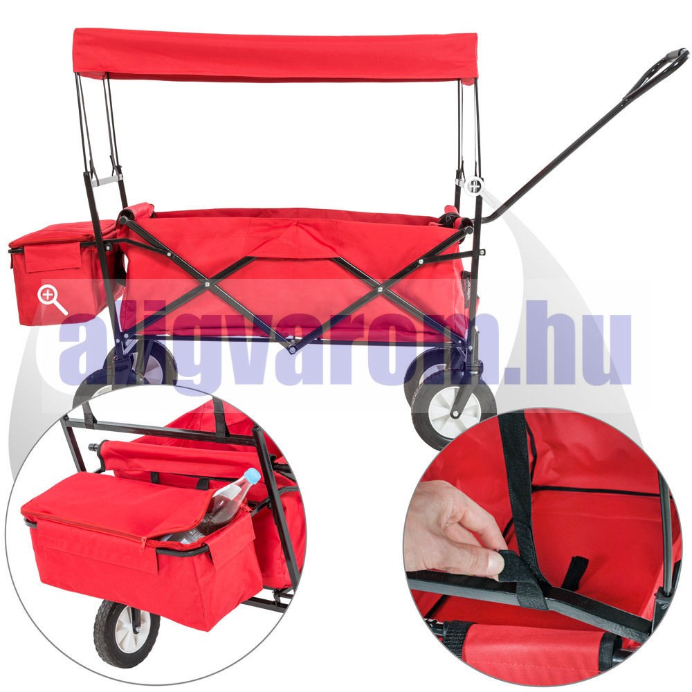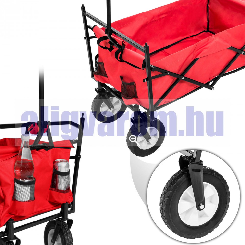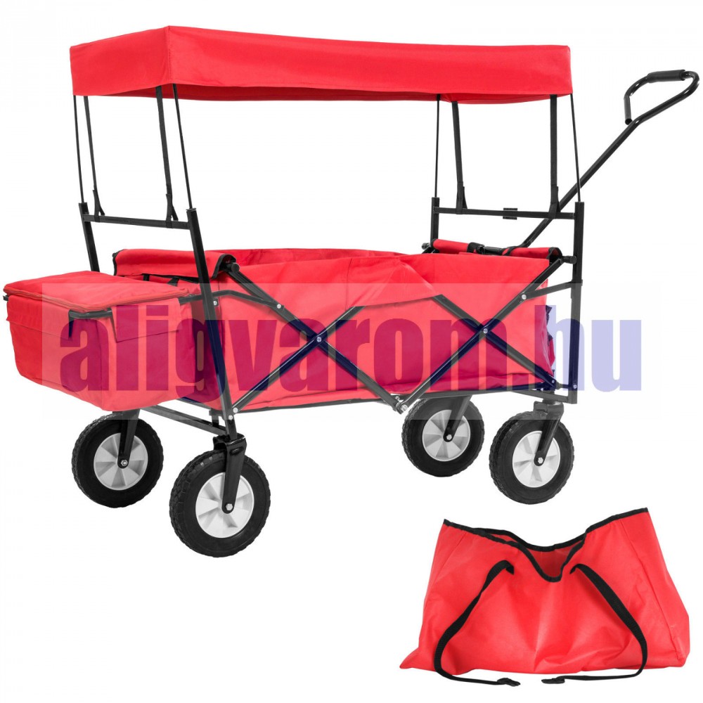 Kiskocsi, összecsukható kézikocsi, nagy méretű, önbeálló kerekekkel, kirándulókocsi kerti kocsi hordtáskával együtt. Csak 11 kg! piros szinben