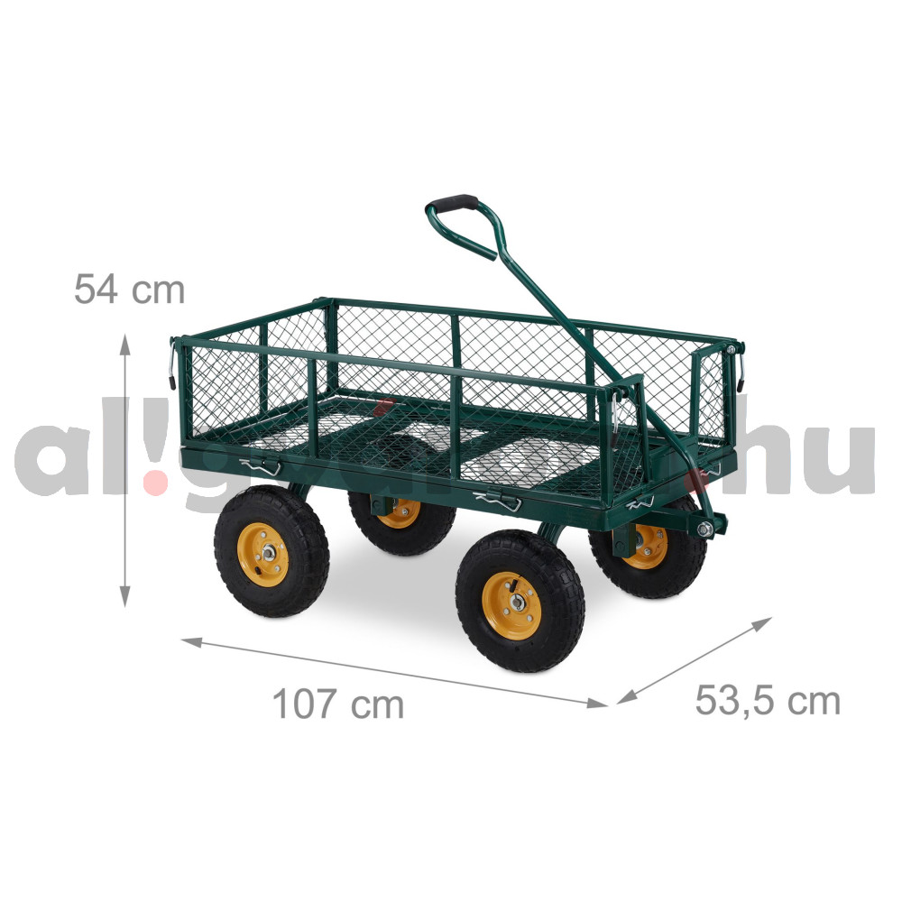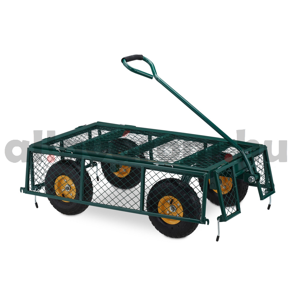 Vessen véget a nehéz dobozok vagy szerszámok cipelésének ezzel a kerti kocsival. Akár egy fesztiválon, akár a kertben, akár bevásárláskor vagy házépítéskor, az acél kézikocsi nagy teherbírásának köszönhetően megkönnyíti a nagy terhek szállítását. A 4 darab pneumatikus gumiabroncsnak köszönhetően egyenletesen halad még az egyenetlen talajon is. Az alacsony hálós kocsi be- vagy kirakodásához az oldalsó részek egyszerűen lehajthatók, így a kocsi platós kocsiként is használható.