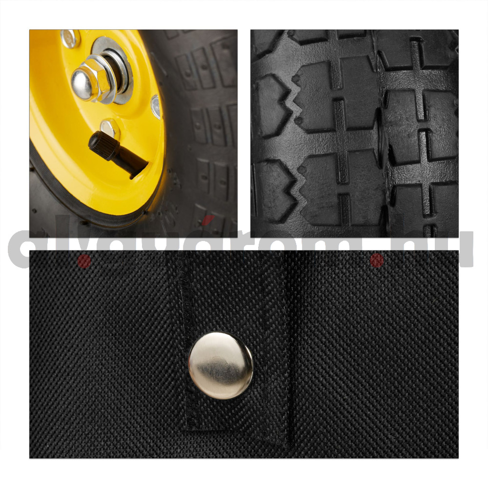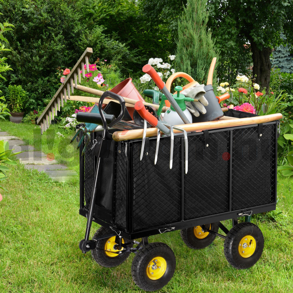 Ez a nagyméretű acél kerti kocsi megkönnyíti a nagy terhek szállítását és mostantól gyerekjáték lesz a kertészkedés. A kézikocsi be- vagy kirakodásához egyszerűen hajtsa le az oldalsó paneleket, vagy akár teljesen vegye le őket. Egyszerűen húzza a kézikocsit a húzórúddal a rendeltetési helyére. A profilozott abroncsoknak köszönhetően az egyenetlen utak sem jelentenek gondot. A nagyméretű belső zsák segítségével könnyebben szállíthat például gyomot vagy homokot.